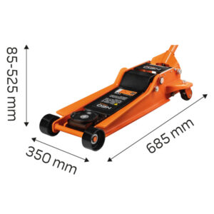 Hydraulický zvedák 3T, kompaktní rozměry 59,2 x 24 x 14,6 cm, výška zdvihu 13,5 cm – 40 cm, páka 74 cm pro bezpečné zvedání