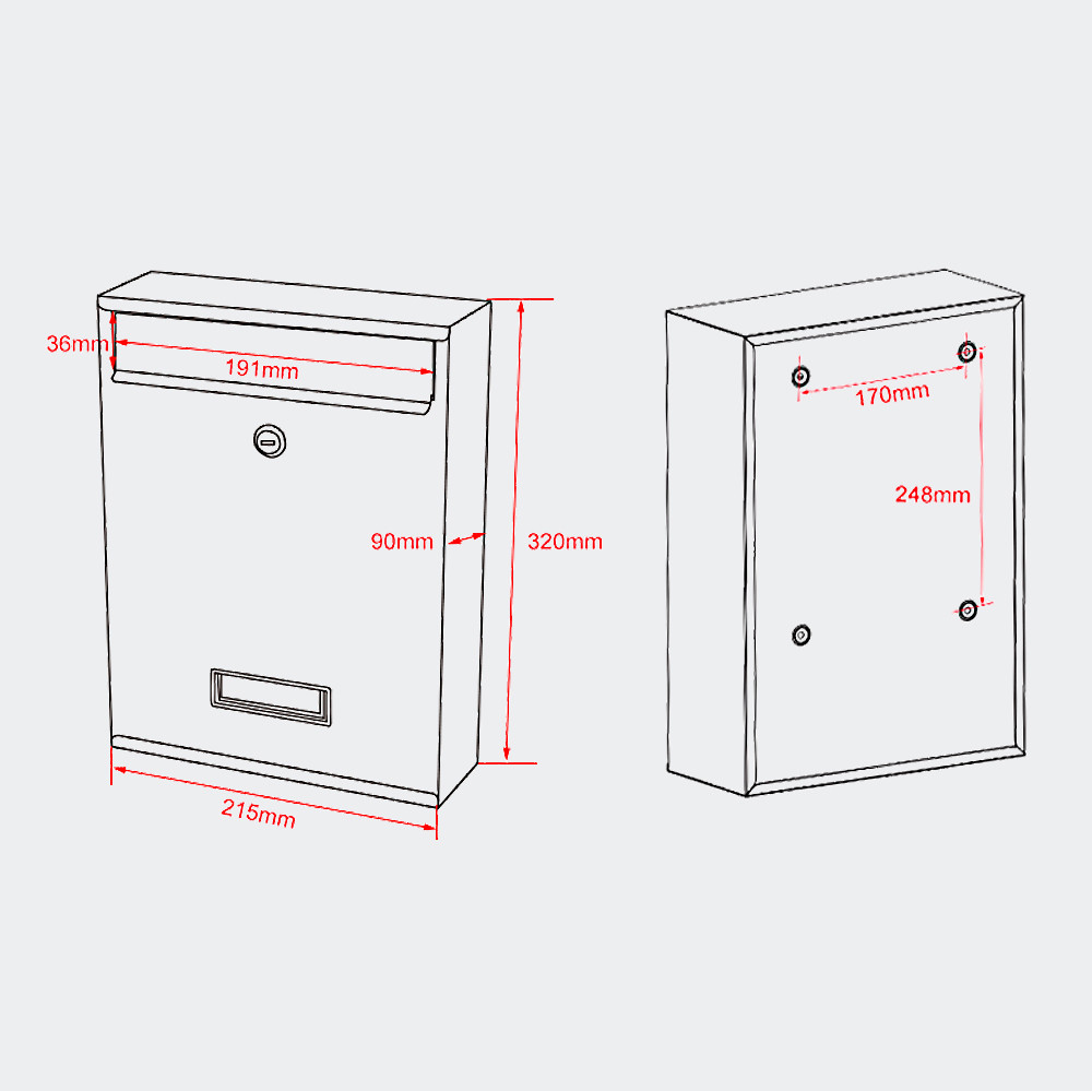 | Rozměry: | Poštovní schránka: 21,5 x 9 x 32 cm Poštovní slot: 19,1 x 3,6 cm |