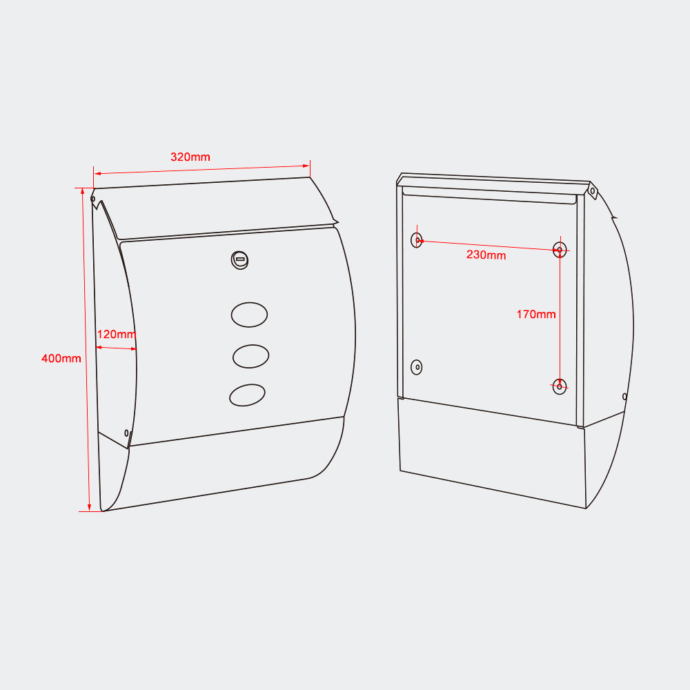 | Rozměry: | Poštovní slot: 315 x 35 mm Poštovní schránka: 320 x 400 x 120 mm Přihrádka na noviny: 95 x 400 x 95 mm |