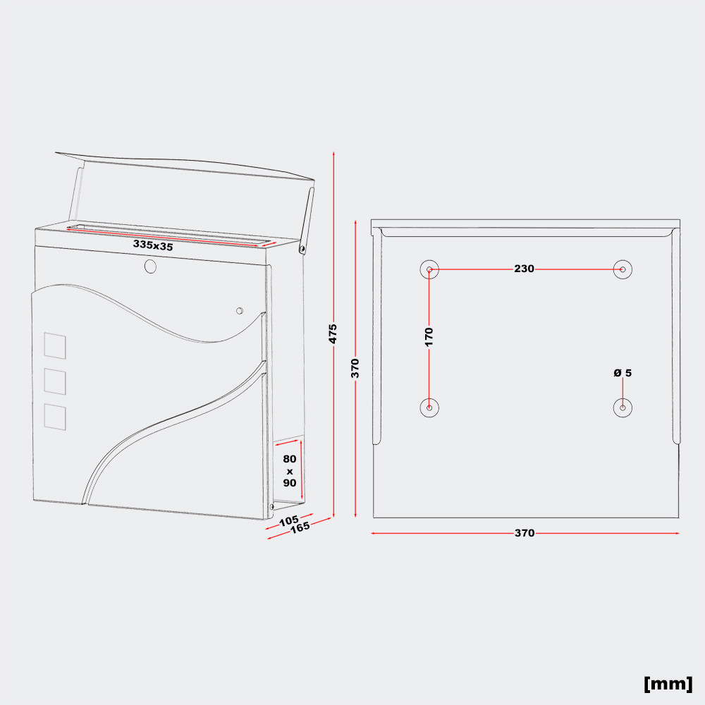 | Rozměry: | Poštovní slot: 335 x 35 mm Poštovní schránka: 370 x 370 x 105 mm Přihrádka na noviny: 80 x 90 x 370 mm Rozteč zadních |