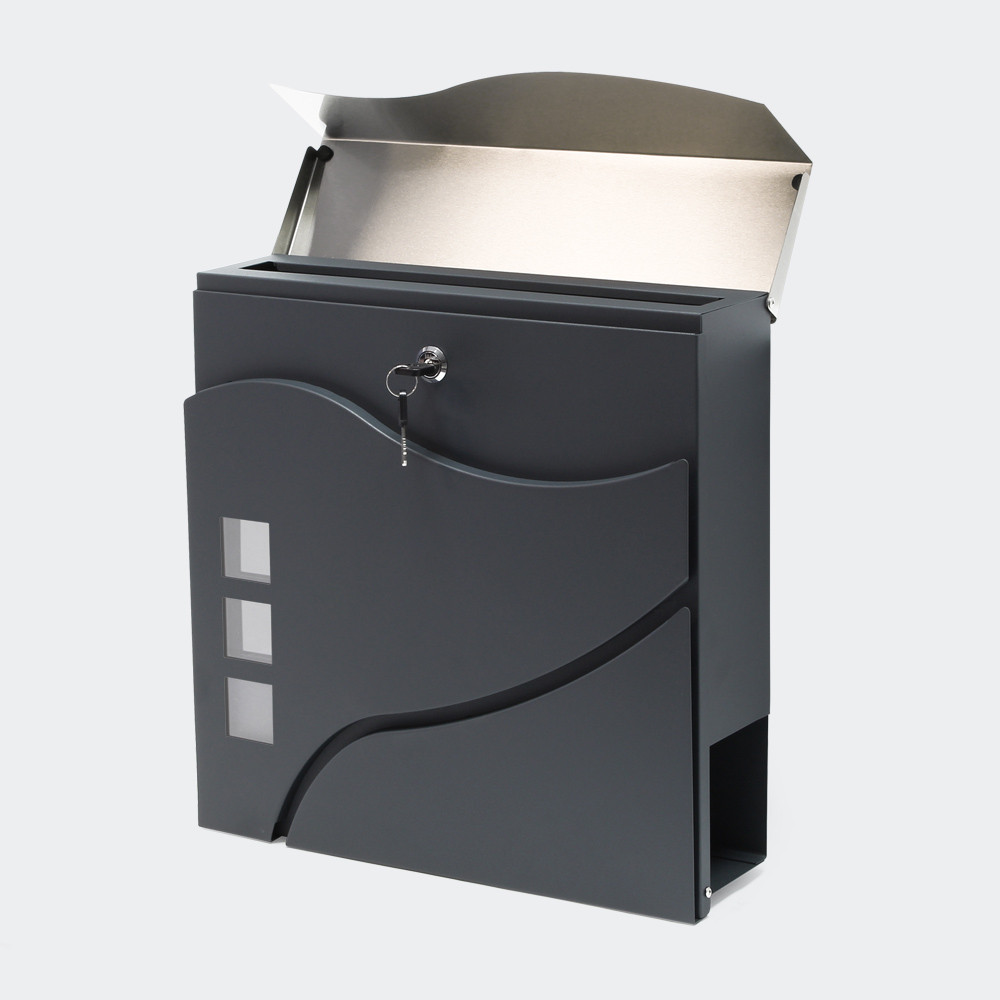Poštovní schránka má velkou přihrádku na dopisy, takže lze odesílat i větší zásilky. Součástí je i montážní materiál. Na spodní straně je také přihrádka na noviny, takže noviny už nemusí být mokré před vchodovými dveřmi, ale mají suché místo, dokud je nepřinesou do domu.