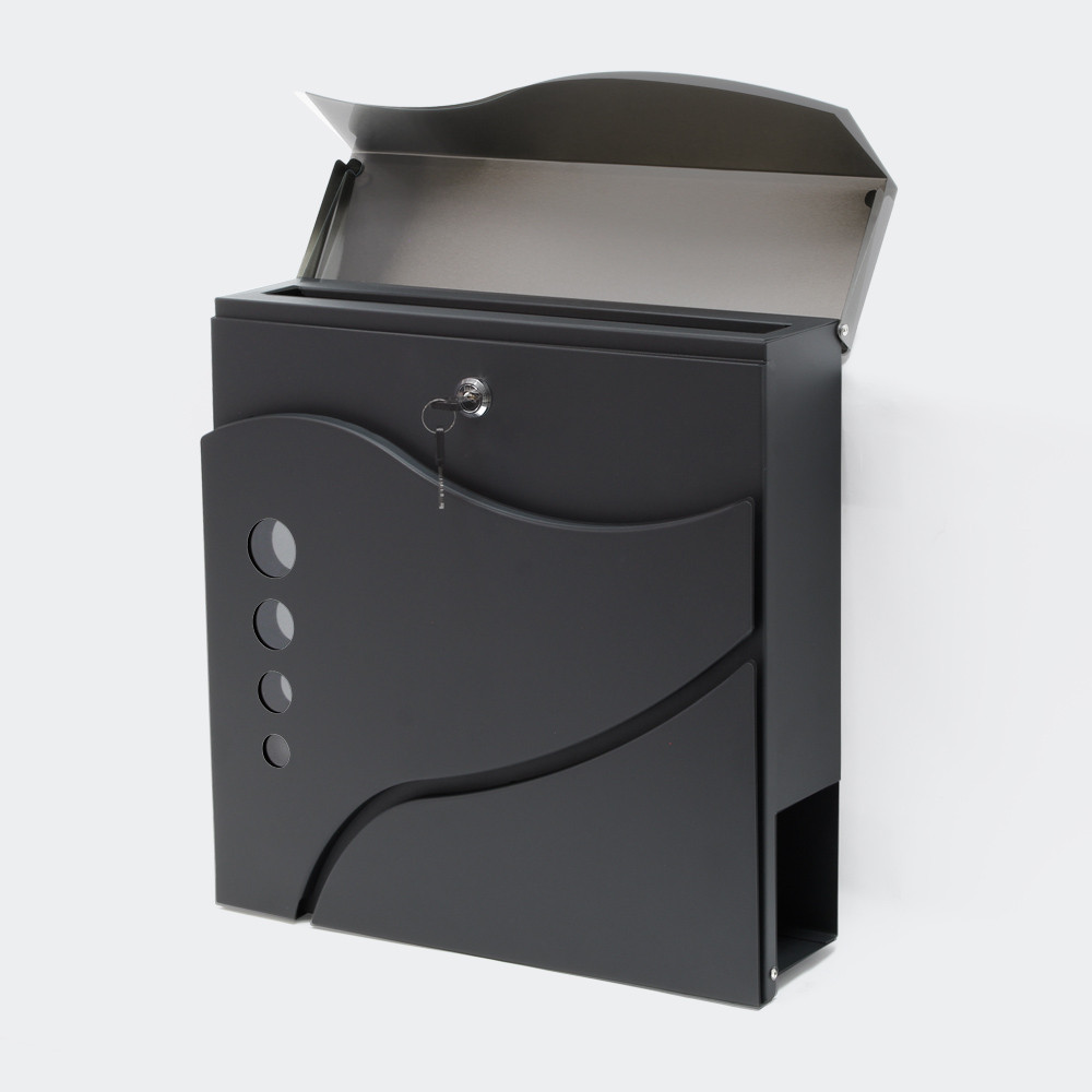 Poštovní schránka má velký slot na dopisy, takže do ní lze vhazovat i větší obálky. Součástí balení je také montážní materiál. Na spodní straně je také přihrádka na noviny, takže noviny již nemusí být skladovány na mokrém prahu, ale mají suché místo, dokud nejsou přineseny do domu.