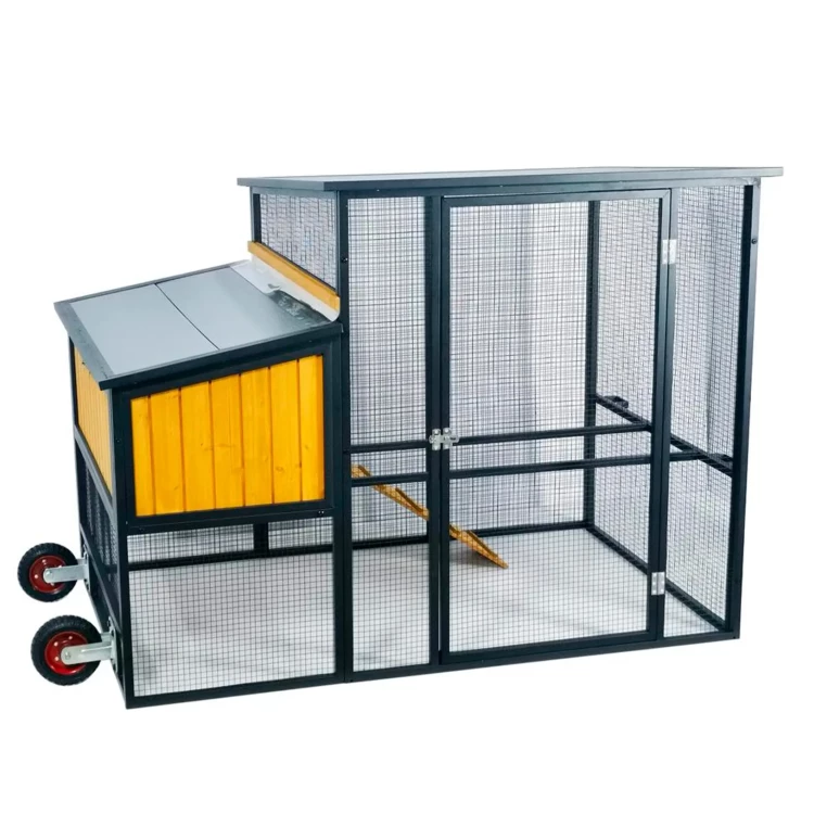 Silnou stránkou kurníku je jeho mobilní konstrukce. Díky robustním kolům a madlu můžete celý kurník snadněji posouvat podle počasí, stínu nebo stavu terénu. V praxi to znamená možnost rychle přesunout slepice ze slunce do příjemnějšího stínu, z podmáčeného místa na sušší část pozemku nebo jim pravidelně dopřávat nový travnatý porost.