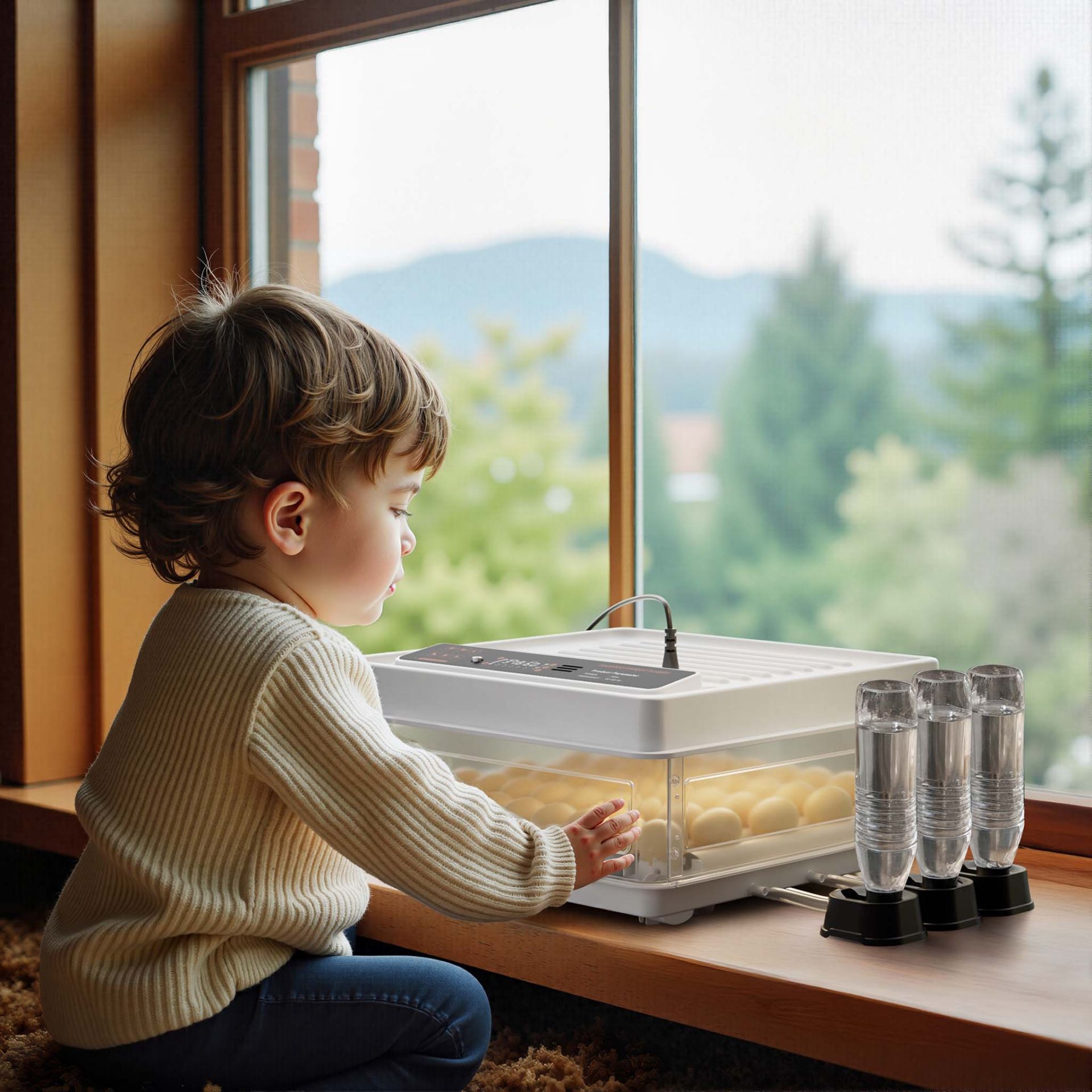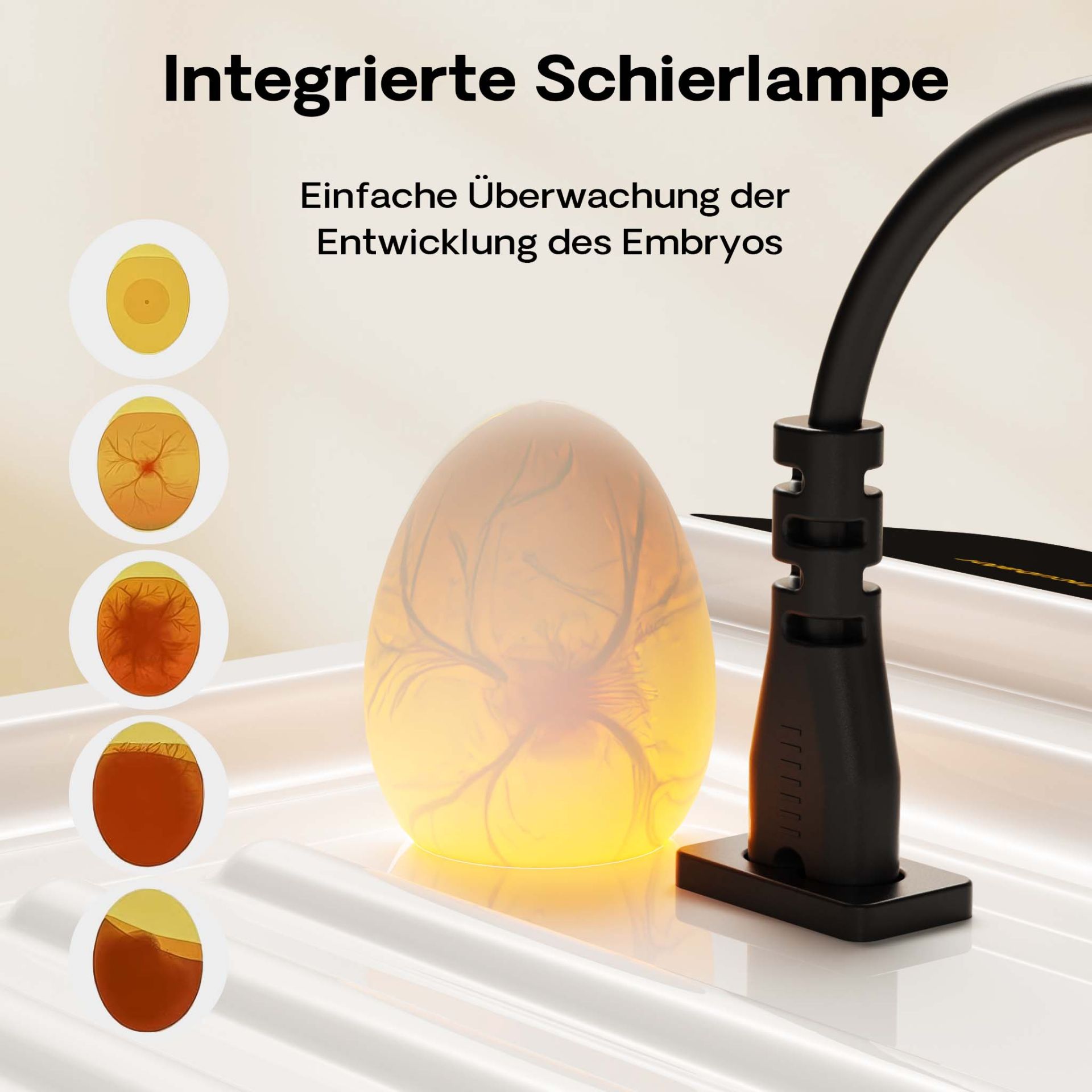 Průhledný plastový kryt poskytuje jasný pohled na proces líhnutí a umožňuje snadné sledování bez otevírání víka. Vestavěný prosvěcovač vajec umožňuje uživatelům kontrolovat vývoj embryí a zajistit, aby vejce byla oploděná a vyvíjela se podle očekávání.