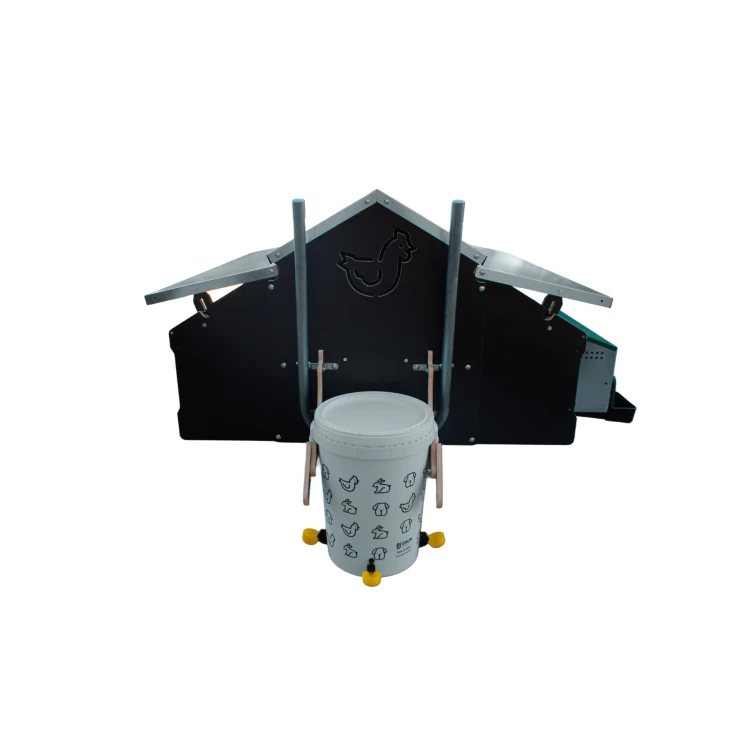 Součástí kurníku je nádrž o objemu 55 litrů s napájecím systémem. Toto řešení umožňuje zajistit slepicím stabilní přístup k vodě a zároveň snižuje potřebu častého doplňování.