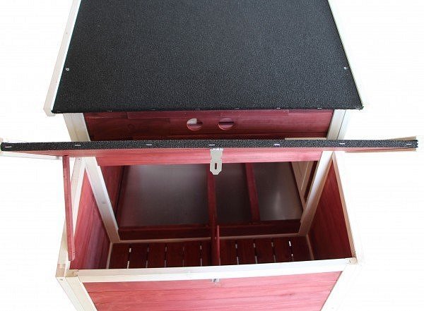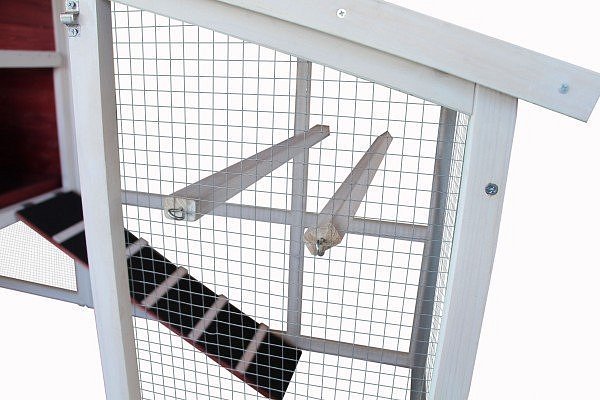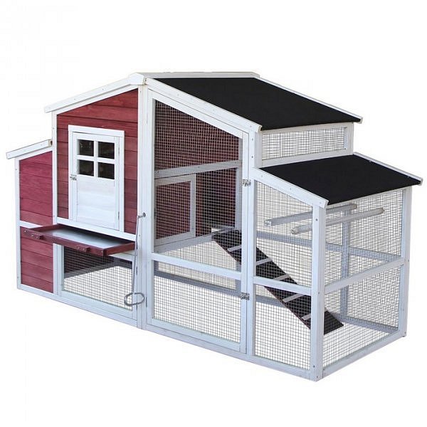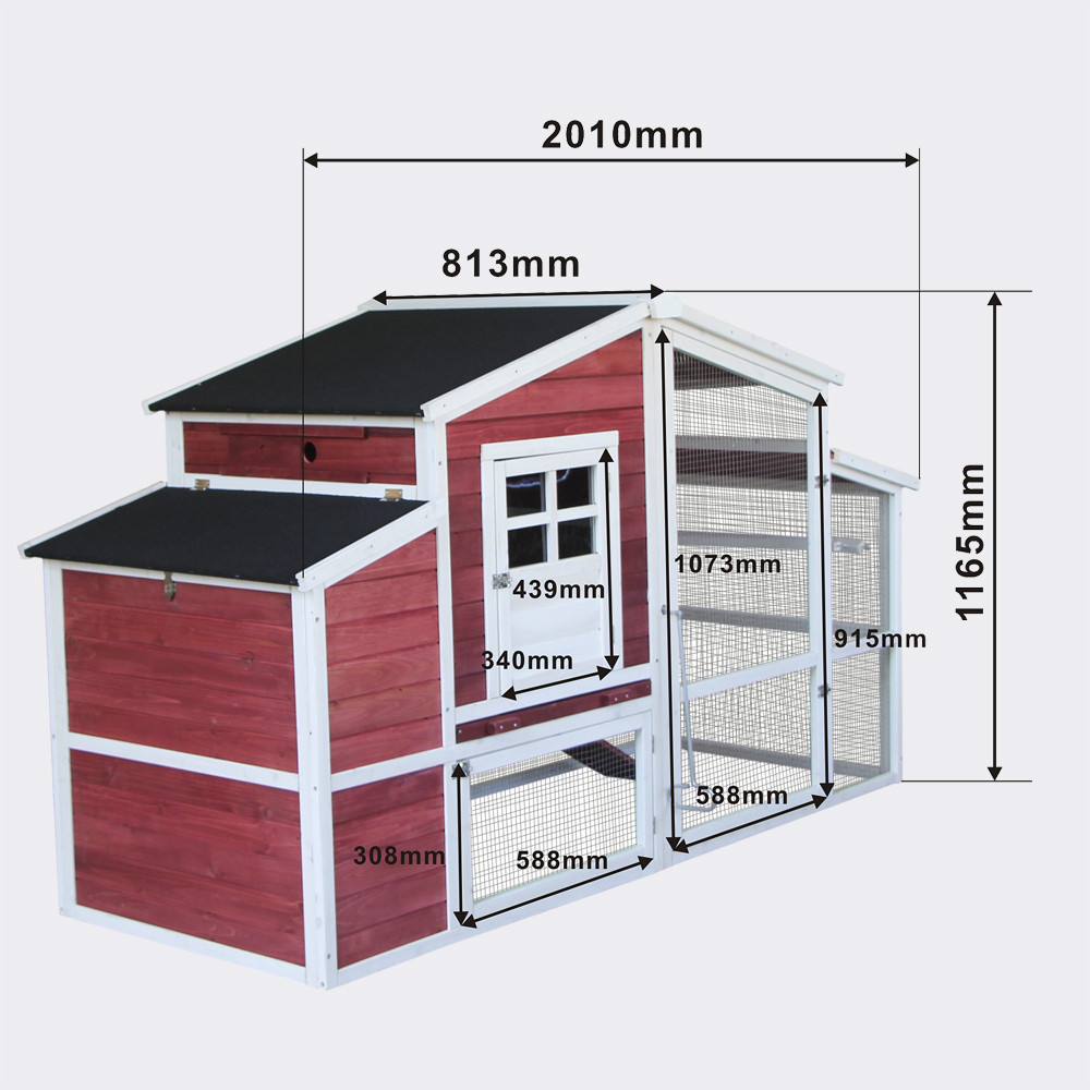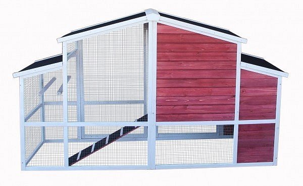 Kurník je vyroben ze smrkového dřeva a má celkový rozměr 201 x 81,3 x 116,5 cm. Integrovaný kurník je vybaven hřadem. Střecha je dobře izolovaná bitumenem a chrání celý kurník před deštěm. Zásobník na trus z pozinkovaného kovu lze vytáhnout pro snadné hygienické čištění. Venkovní prostor s kurníkem spojuje protiskluzová rampa. Odklápěcí střecha budky a dvířka kurníku a výběhu zajišťují snadný přístup pro kontrolu hnízda atd.