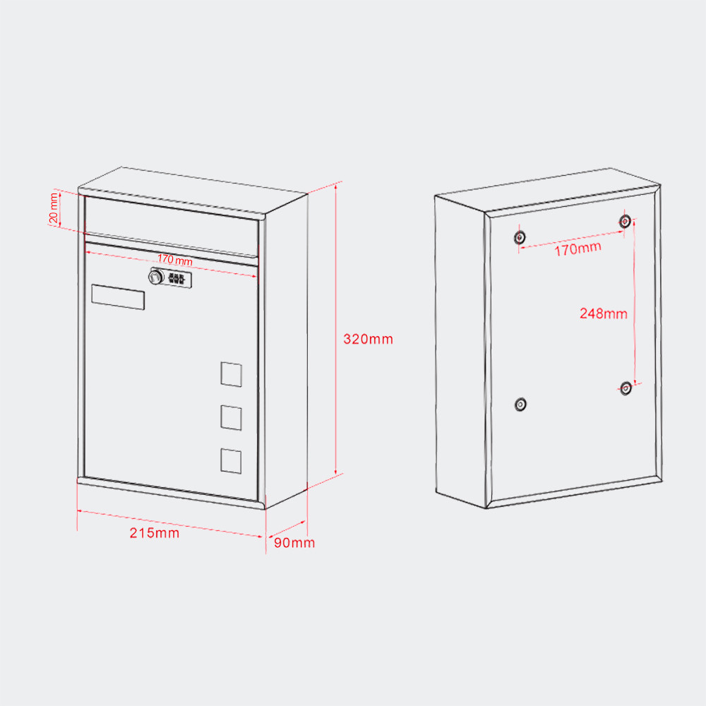 | Rozměry: | Poštovní schránka: 21,5 x 9 x 32 cm Štěrbina na dopisy: 17 x 2 cm |
