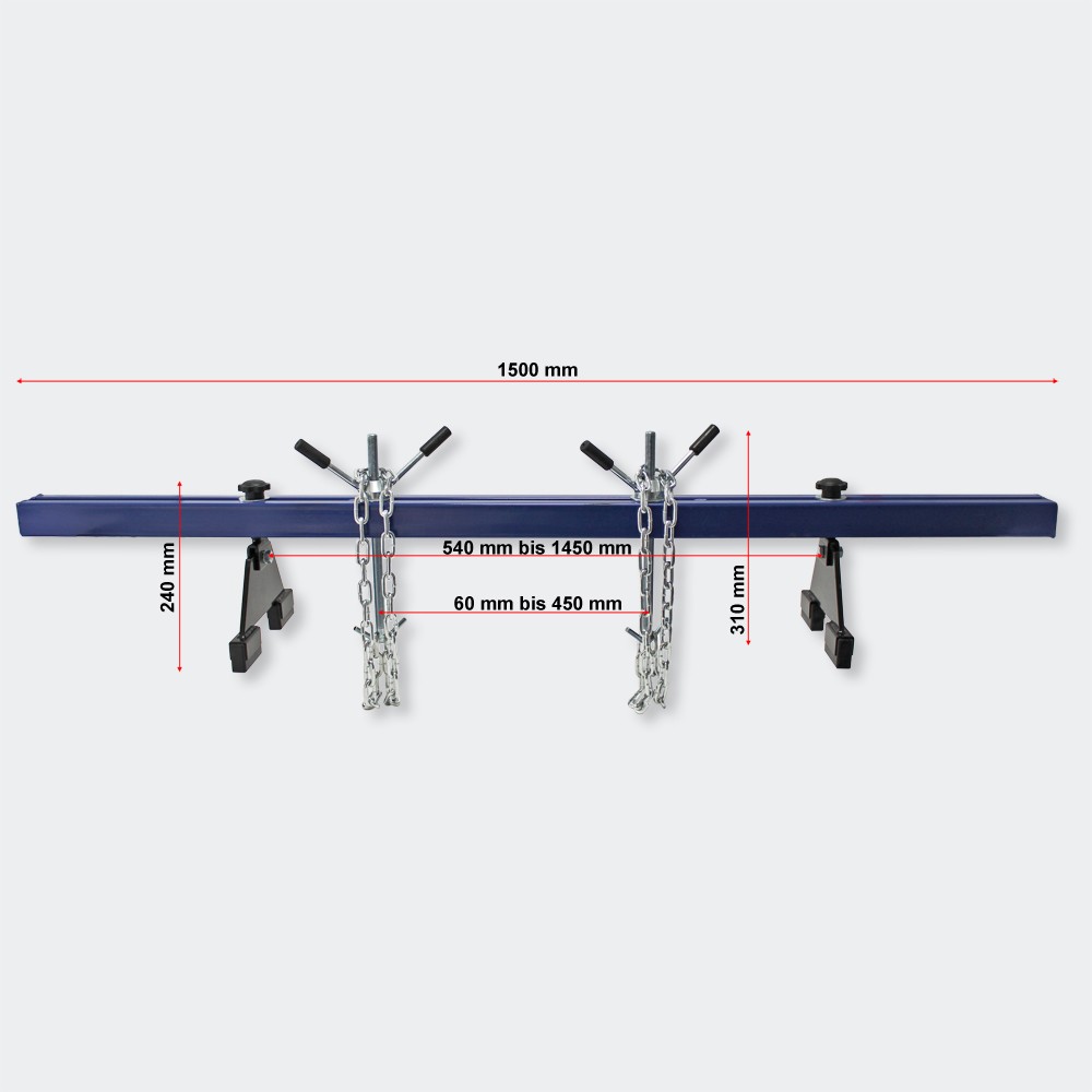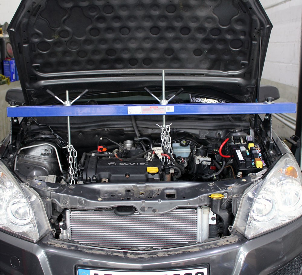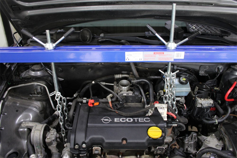 • Kapacita až 500 kg Engine Hoist je praktická pomoc pro práci na clutch-, rozvodový řemen, motoru nebo převodovky. Držák motoru, který je vybaven dvěma nastavitelnými vřeteny, otočnými nosníky a pevnými řetězy, lze motorový můstek snadno nastavit i na silně sklonené blatníky. Okraje blatníků jsou pečlivě chráněny gumovými základnami, aby nedošlo k jejich poškození.