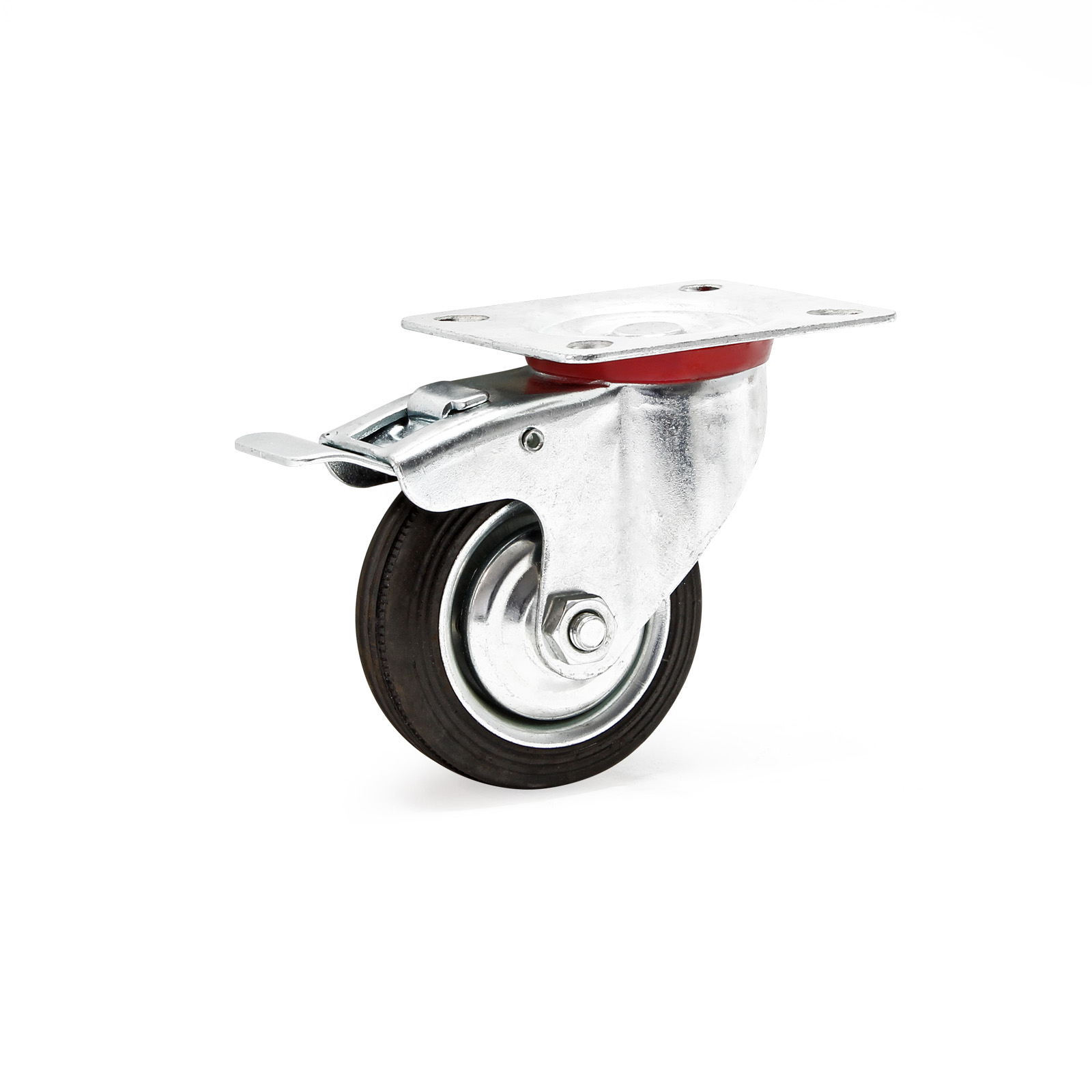 Získáte pevné gumové kolečko s kovovým ráfkem, aretační brzdou a robustní otočnou deskou pro připevnění na přepravní zařízení.