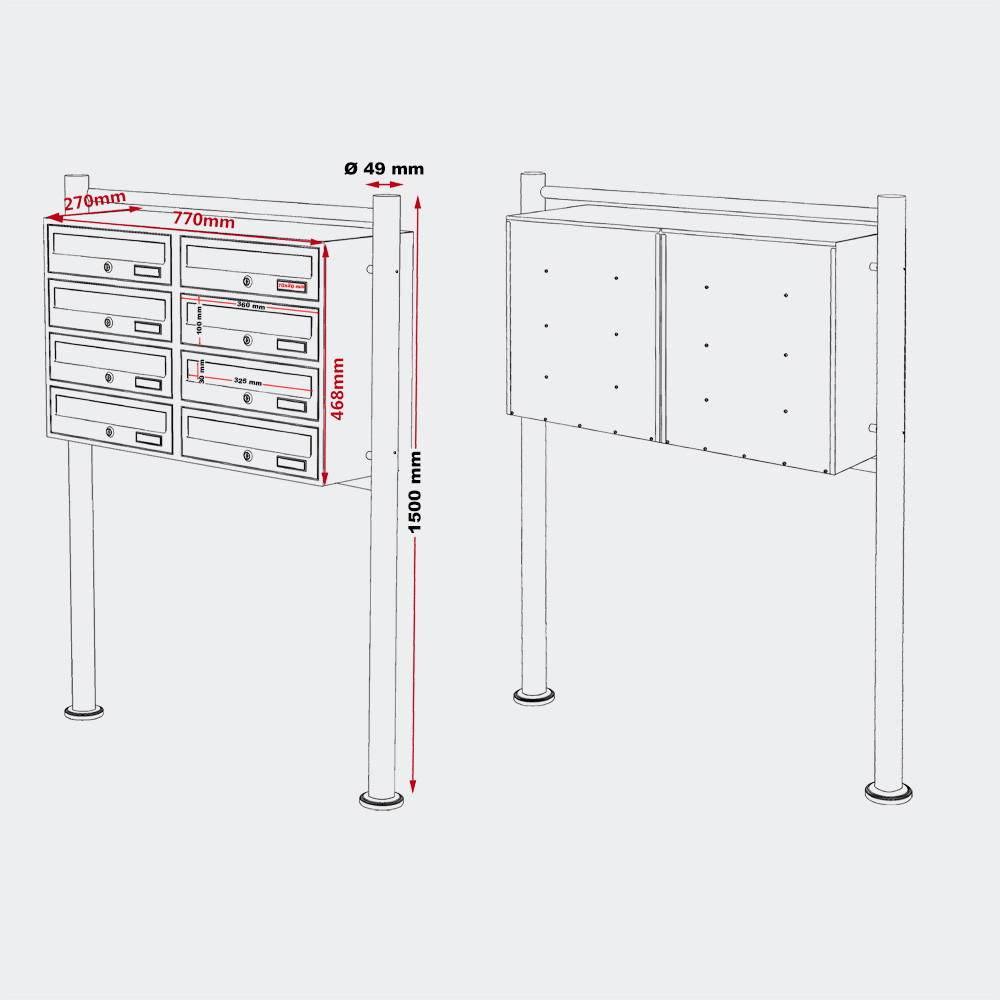 Poštovní schránka má rozměry 770 x 270 x 468 mm. Součástí dodávky jsou odpovídající zemní kotvy, aby bylo možné poštovní schránku instalovat přímo na místo určení.