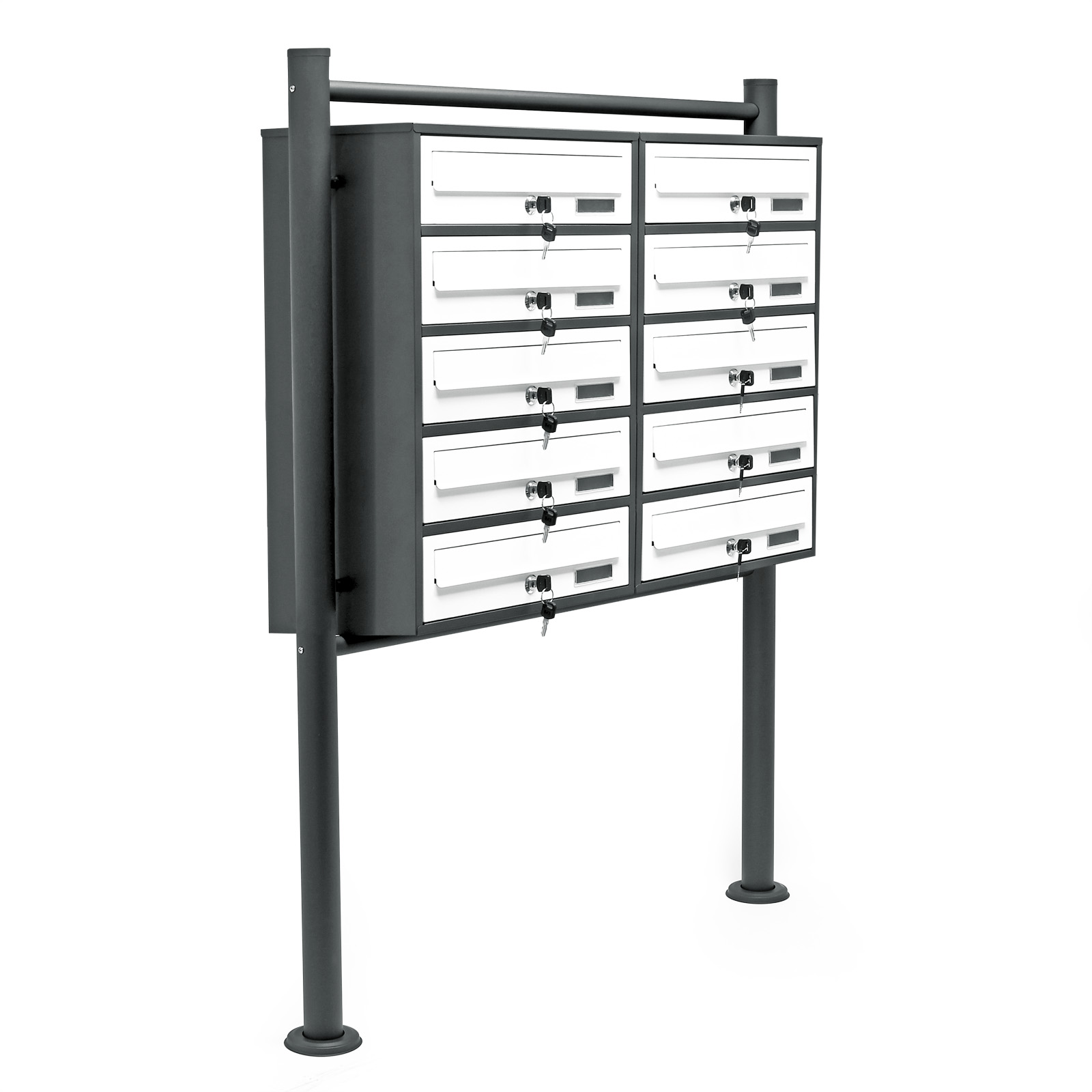 Jsou-li zarovnány do dvou řad po 5 přihrádkách a připevněny k robustnímu rámu, jehož dva sloupy mají výšku 1 500 mm a průměr Ø 49 mm, poštovní schránky zabírají minimum místa. Bez rámečku zaujímá krabicový systém plochu 770 x 270 x 582 mm. Poštovní schránky tak mají výšku 100 mm a nabízejí dostatek prostoru pro více poštovních zásilek. Slot na poštu o velikosti 325 x 30 mm umožňuje pohodlné doručování dopisů a novin bez poškození předmětů při vkládání.