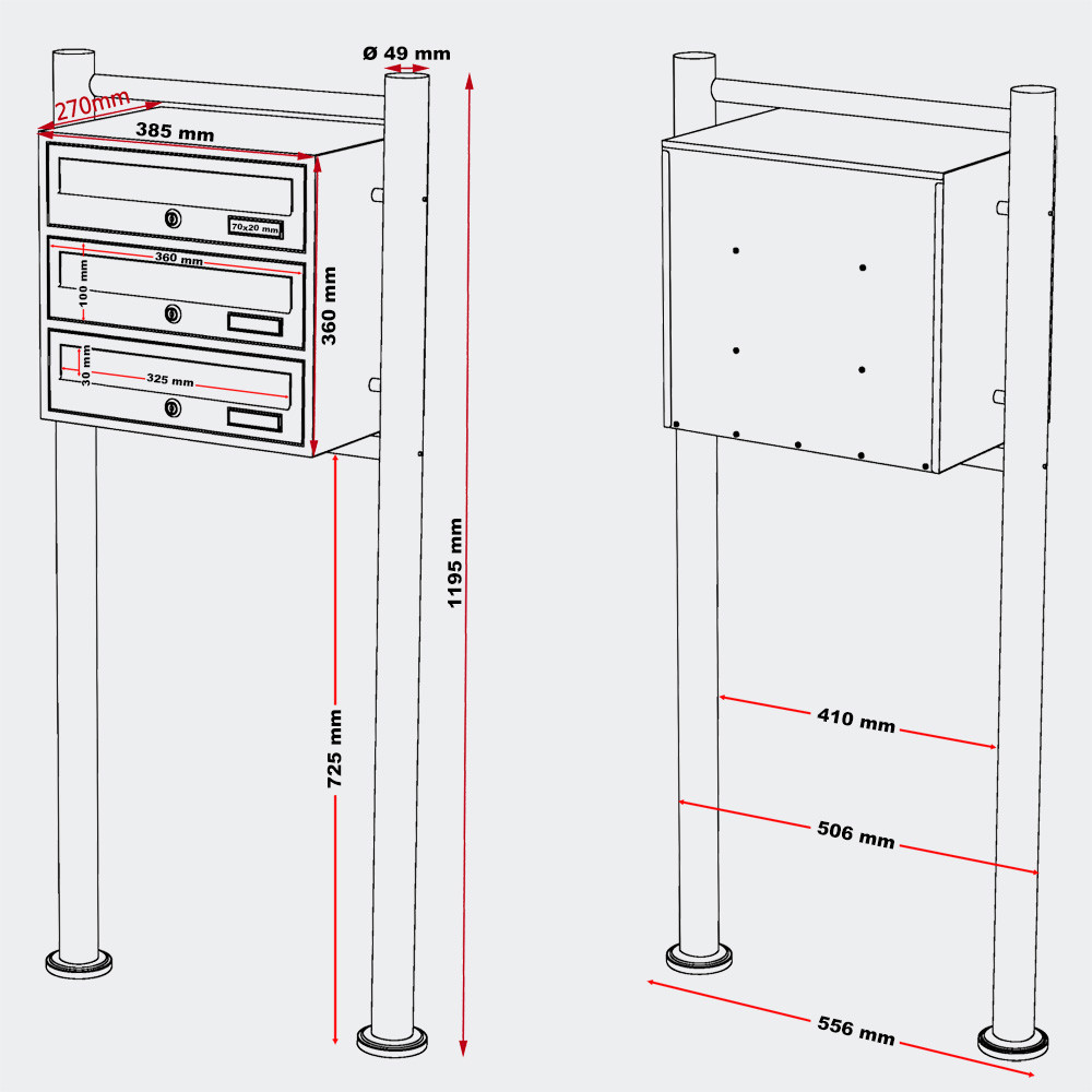 | Rozměry: | Přihrádka: 360 x 270 x 100 mm Slot na dopisy: 325 x 30 mm Schránka na dopisy: 360 x 385 x 270 mm Stojan: 1195 x Ø 49 mm / 85 mm |