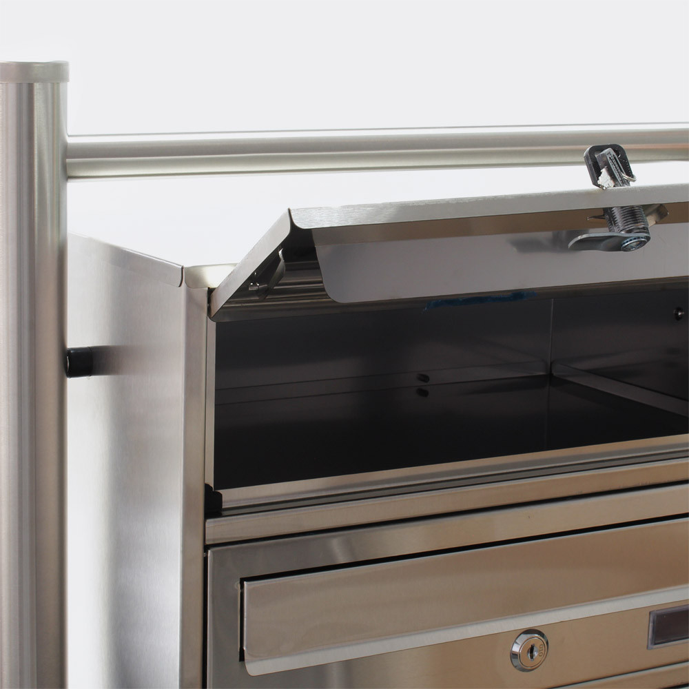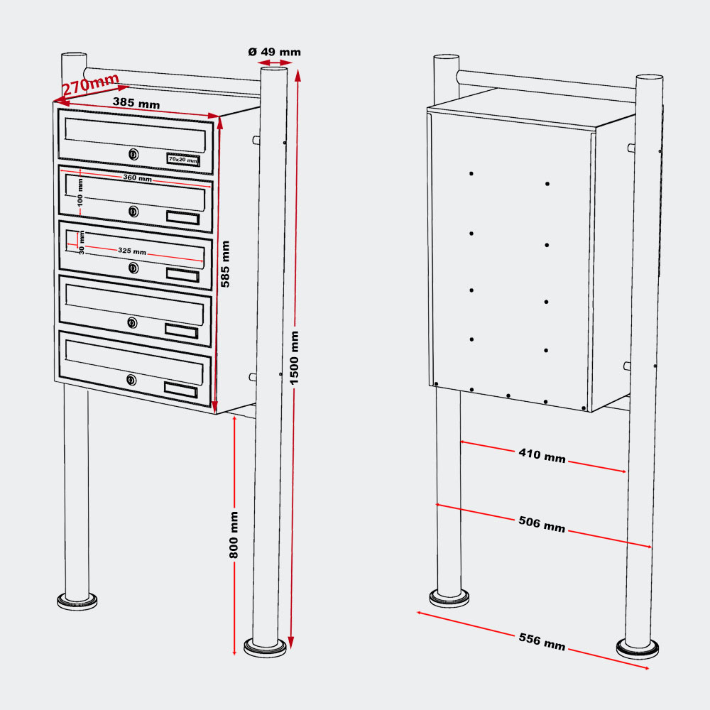 Postavené na sebe a připevněné k robustnímu rámu, jehož dva sloupy mají výšku 1 500 mm a průměr Ø 49 mm, zabírají poštovní schránky minimum místa. Bez rámečku zabírá krabicový systém plochu 385 x 270 x 585 mm. Poštovní schránky tak mají výšku 100 mm a nabízejí dostatek prostoru pro více poštovních zásilek. Slot na poštu o velikosti 325 x 30 mm umožňuje pohodlné doručování dopisů a novin bez poškození předmětů při vkládání.