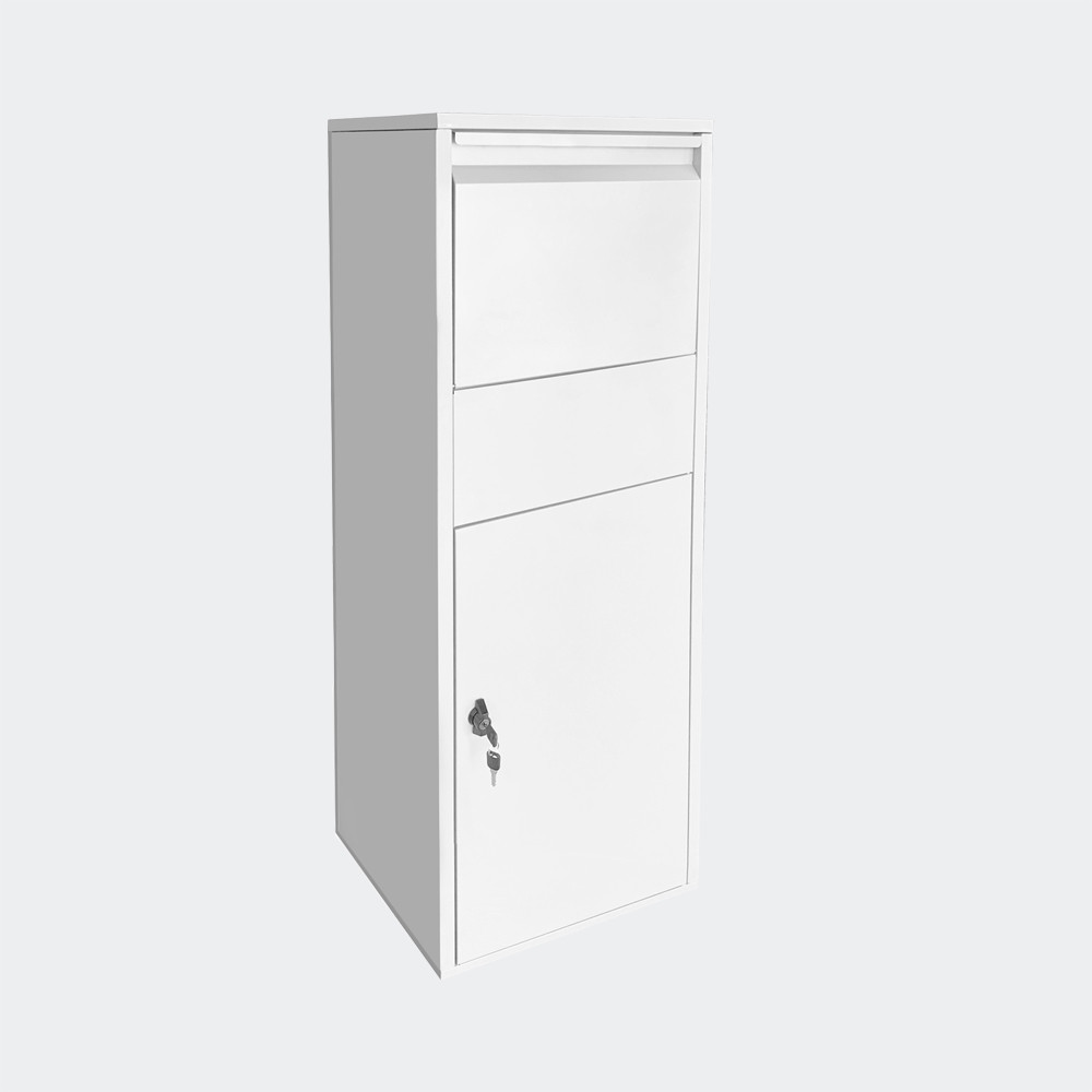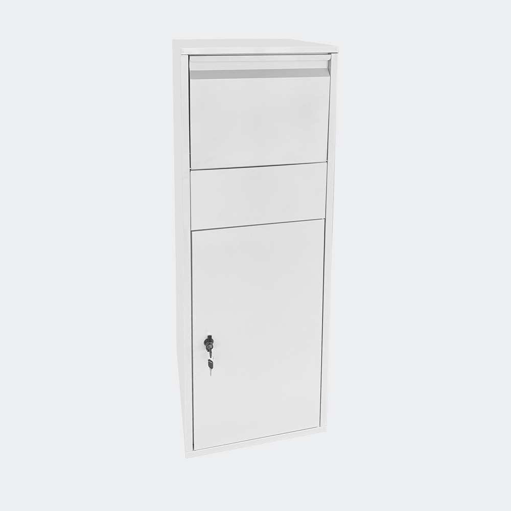 S touto bílou balíkovou krabicí můžete přijímat balíčky a další zásilky, aniž byste byli doma. Položky, které jsou větší než normální písmena, se do většiny poštovních schránek nevejdou. To není případ Paketboxu, který má speciální systém pro odkládání balíků. Horní klopa se otevře a balíček se umístí do prostředního patra. Když je klopa zavřená, otevře se střední patro a balíček spadne do spodní části krabičky. Jakmile je zásilka ve spodní části krabice, střední patro se opět zavře a do krabice lze umístit další balíček. Chcete-li předměty vyjmout, odemkněte zámek ve spodním segmentu balíkové schránky a otevřete velkou spodní klopu. Nyní můžete své zásilky snadno vyzvednout.