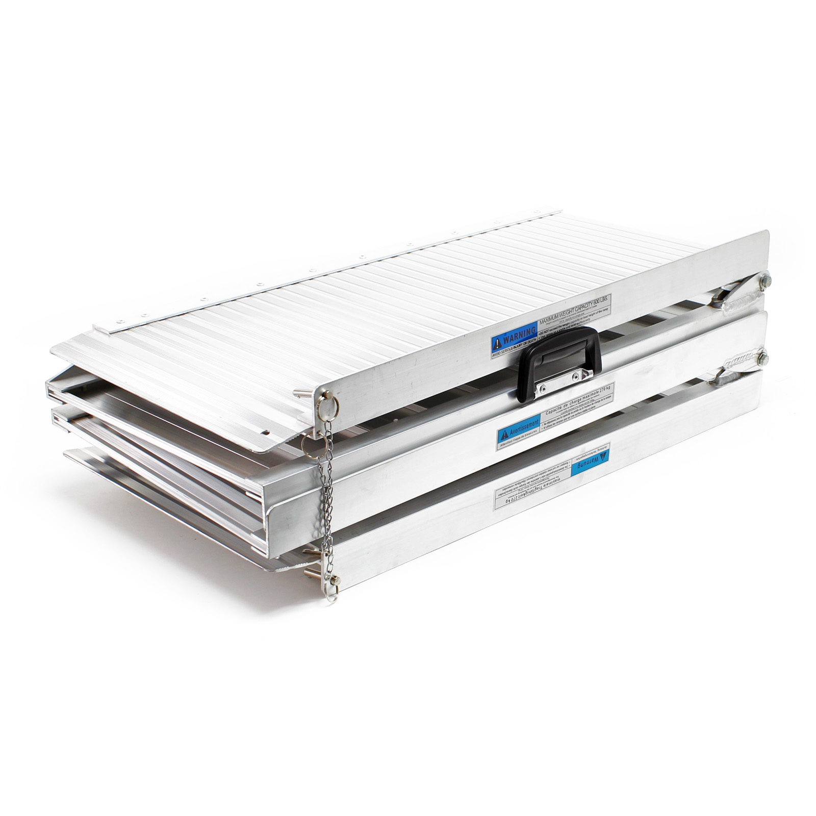 Tato praktická dvojitá skládací rampa pro invalidní vozík vyrobená z lehkého hliníku se snadno přepravuje a je dokonalým mobilním pomocníkem . Je skládací jak na délku, tak na šířku. Schodišťové stupně jsou bez námahy přemostěny a zajišťují bezbariérový přístup .
