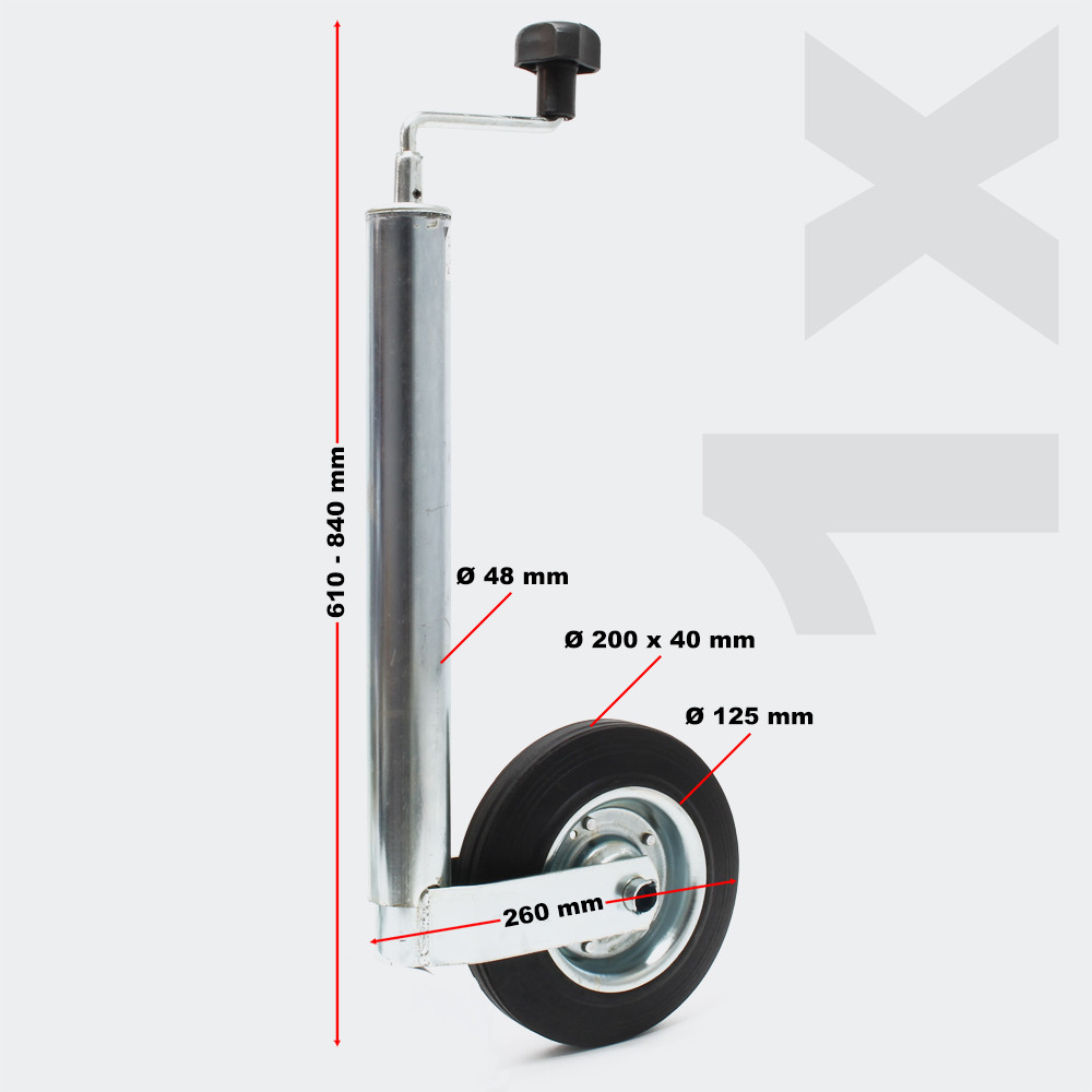 Kolo přívěsu je ideální pro malé a střední přívěsy, karavany a mnoho dalšího. V klidovém stavu kolo absorbuje tlak kulové spojky, udržuje oj v rovině a zabraňuje převrácení přívěsu na oj. Karavany a přívěsy se také neuvěřitelně snadno manévrují.