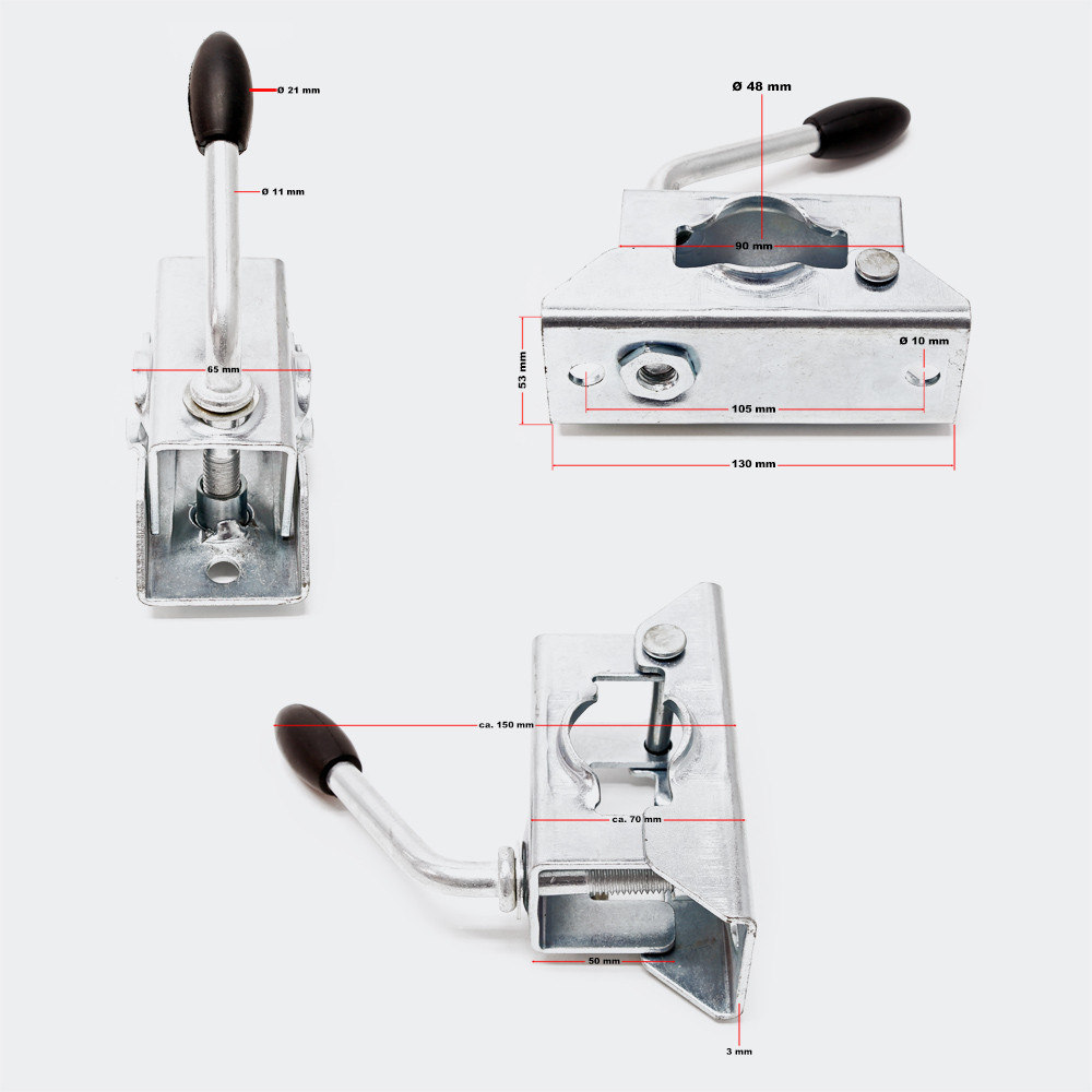 | Rozměry: | Opěrné kolo: 610 x 245 x 48 mm Upínací držák: 130 x 70 x 150 mm Podpěry: 745 x Ø 48 mm Klíny pod kola: 220 x 90 x 100 mm |