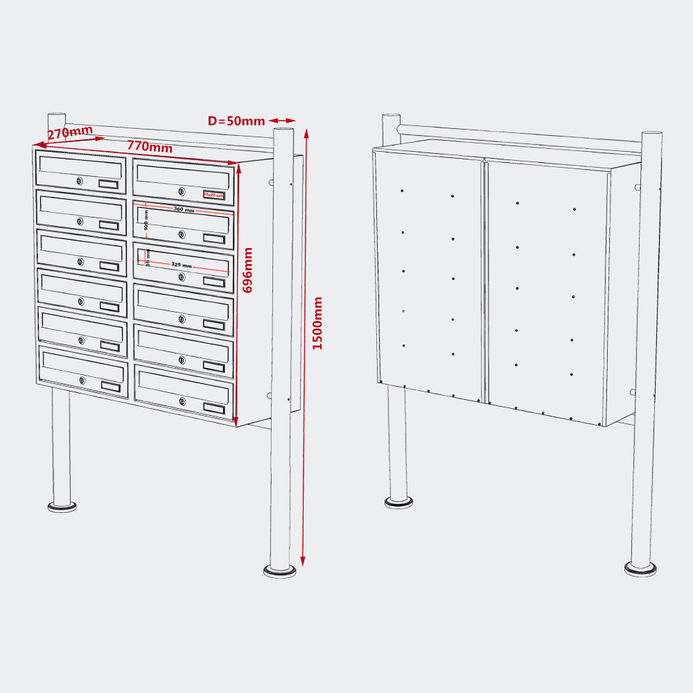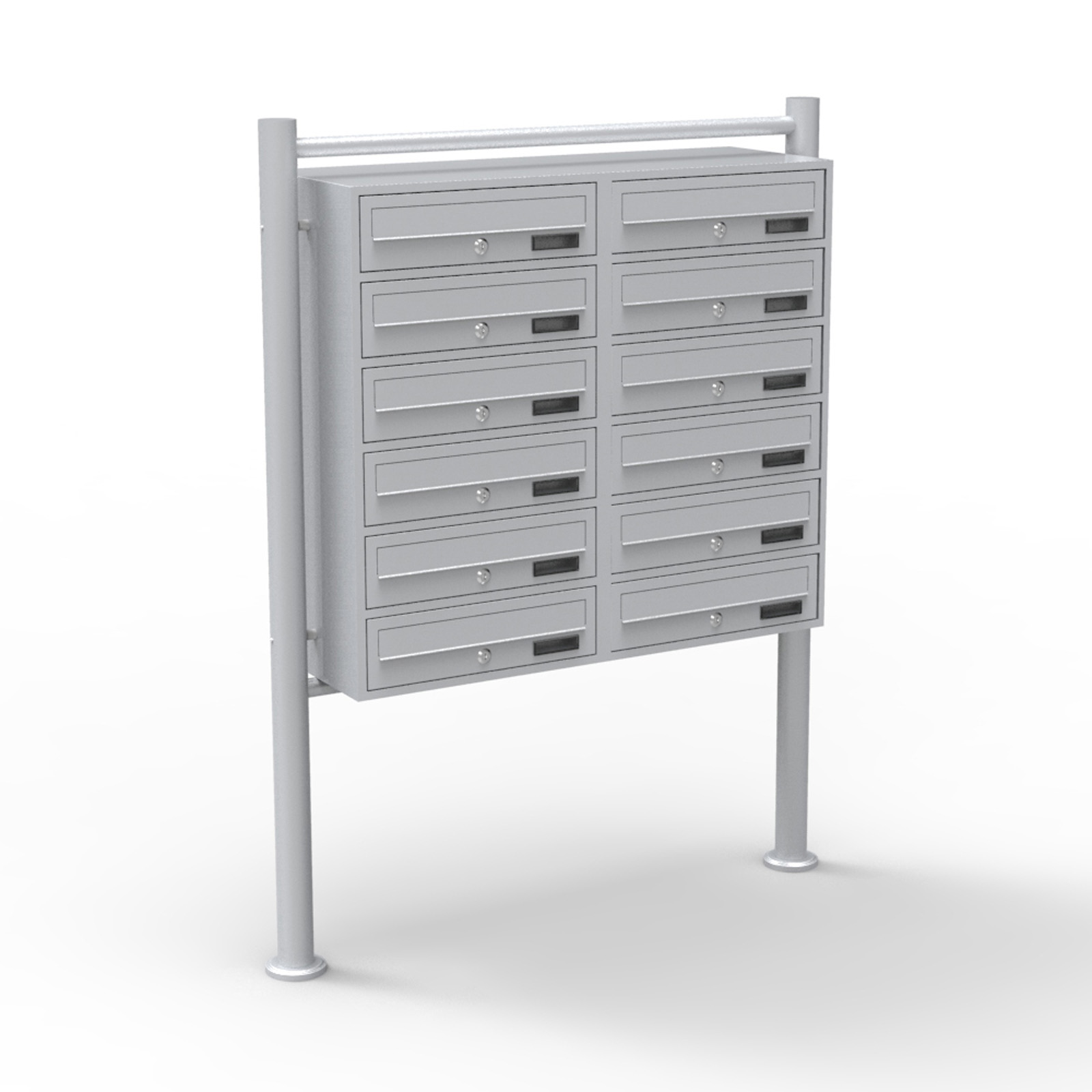 Poštovní schránka je vyrobena z robustní nerezové oceli, předem sestavený stojan z leštěné nerezové oceli. Pro každého nájemce je k dispozici samostatná uzamykatelná poštovní schránka se samostatnou částí pro typový štítek. Pro každou poštovní schránku jsou dodávány dva klíče. Vzhledem k tomu, že stojan je již namontován, lze montáž poštovní schránky na místě přímo provést pomocí hmoždinek, které jsou součástí dodávky.