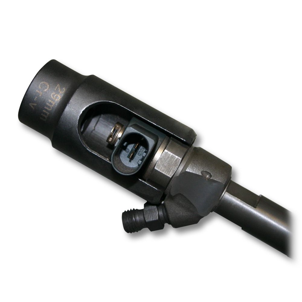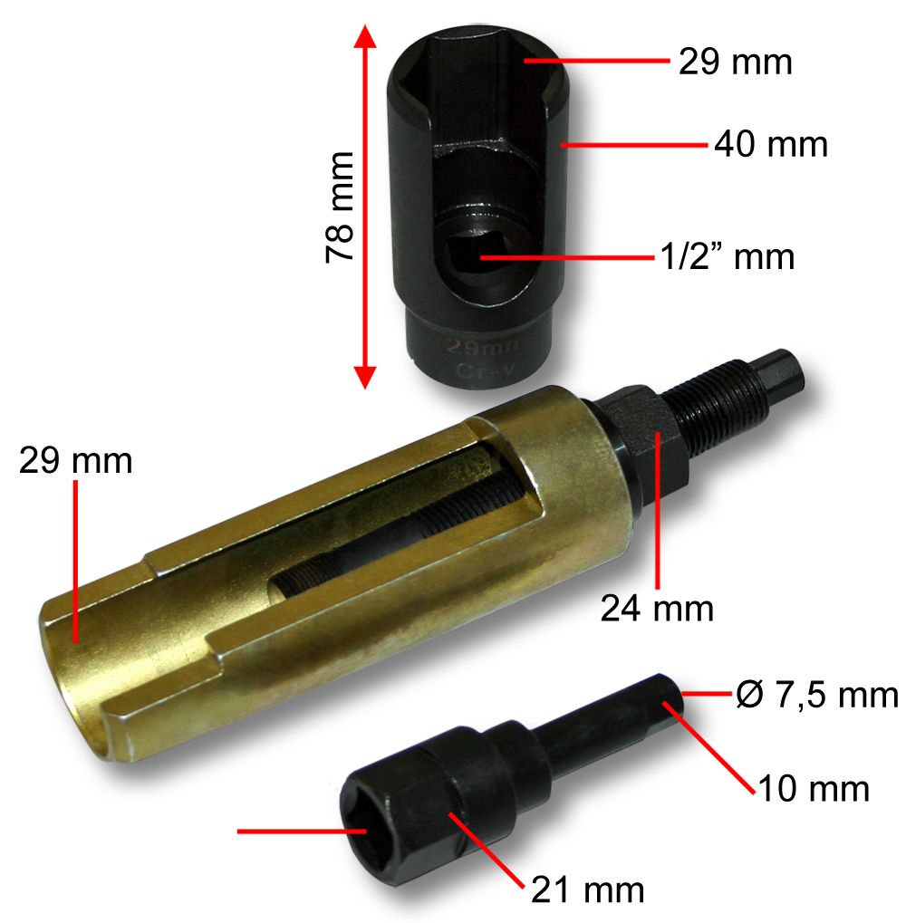 Sada obsahuje speciální vnější šestihrannou matici (šířka přes plochý 29 mm) a čtyřhranný pohon 1/2″. Otevírá se z boku pro usnadnění demontáže hlavy trysky ze vstřikovací trysky, mimo jiné Bosch, pro motory CDI a Mercedes OM 611, 612, 613.