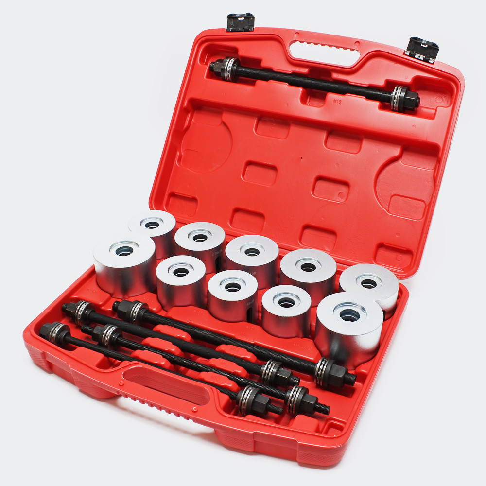 Sada nářadí 27 ks. pro odstraňování a zatahování ložisek všeho druhu (například tichá ložiska, kuličková ložiska nebo pryžová ložiska), ložiska zadní nápravy, pouzdra zadní nápravy, ovládací ramena nebo podobné části. Díky přiloženému speciálnímu nástroji pro rychlou výměnu tichých ložisek již není nutné demontovat kompletní sestavu, ale ložisko lze vyměnit přímo. Sada také obsahuje soupravu pro montáž a demontáž ložisek na vozidle, jako jsou nápravová nebo závěsná ložiska.