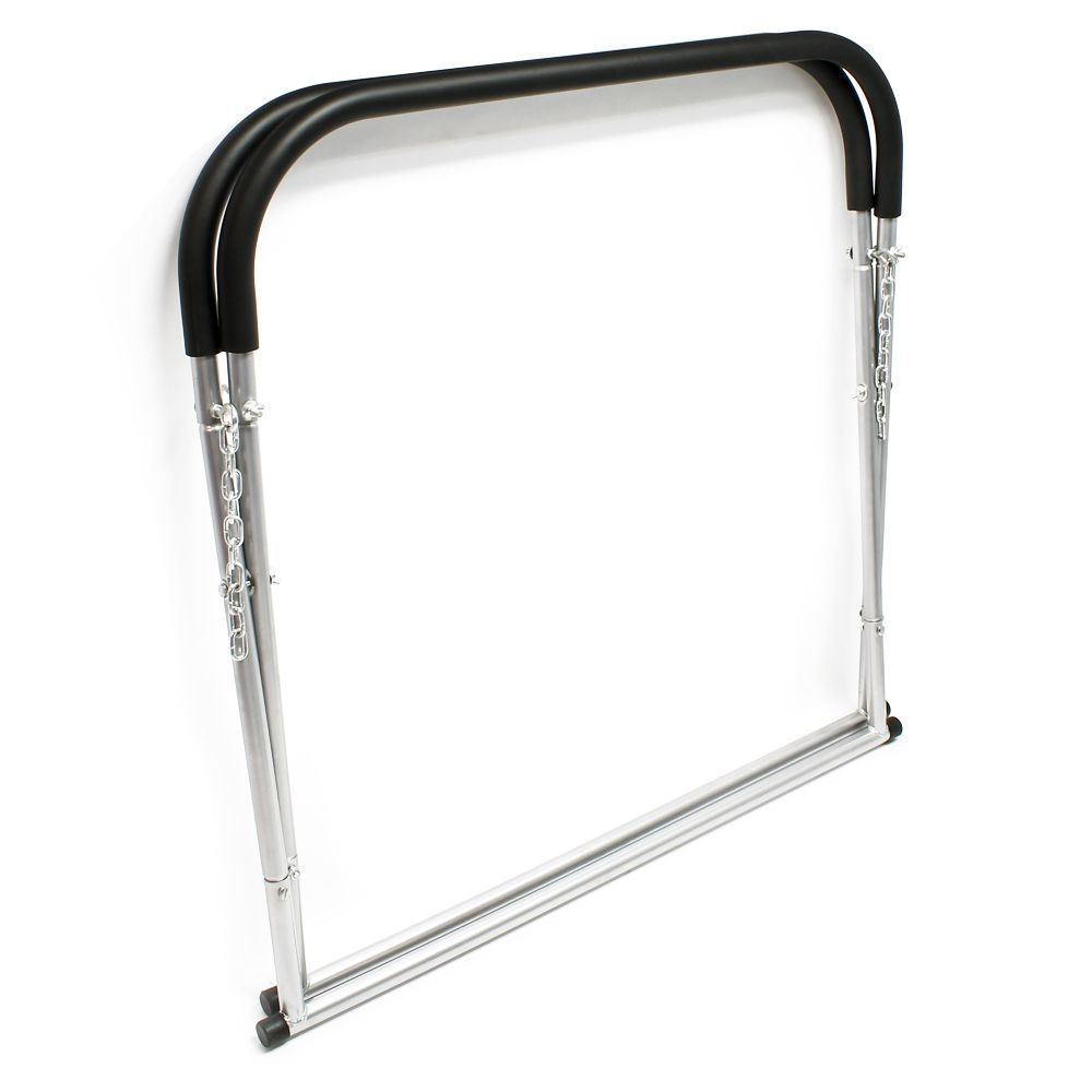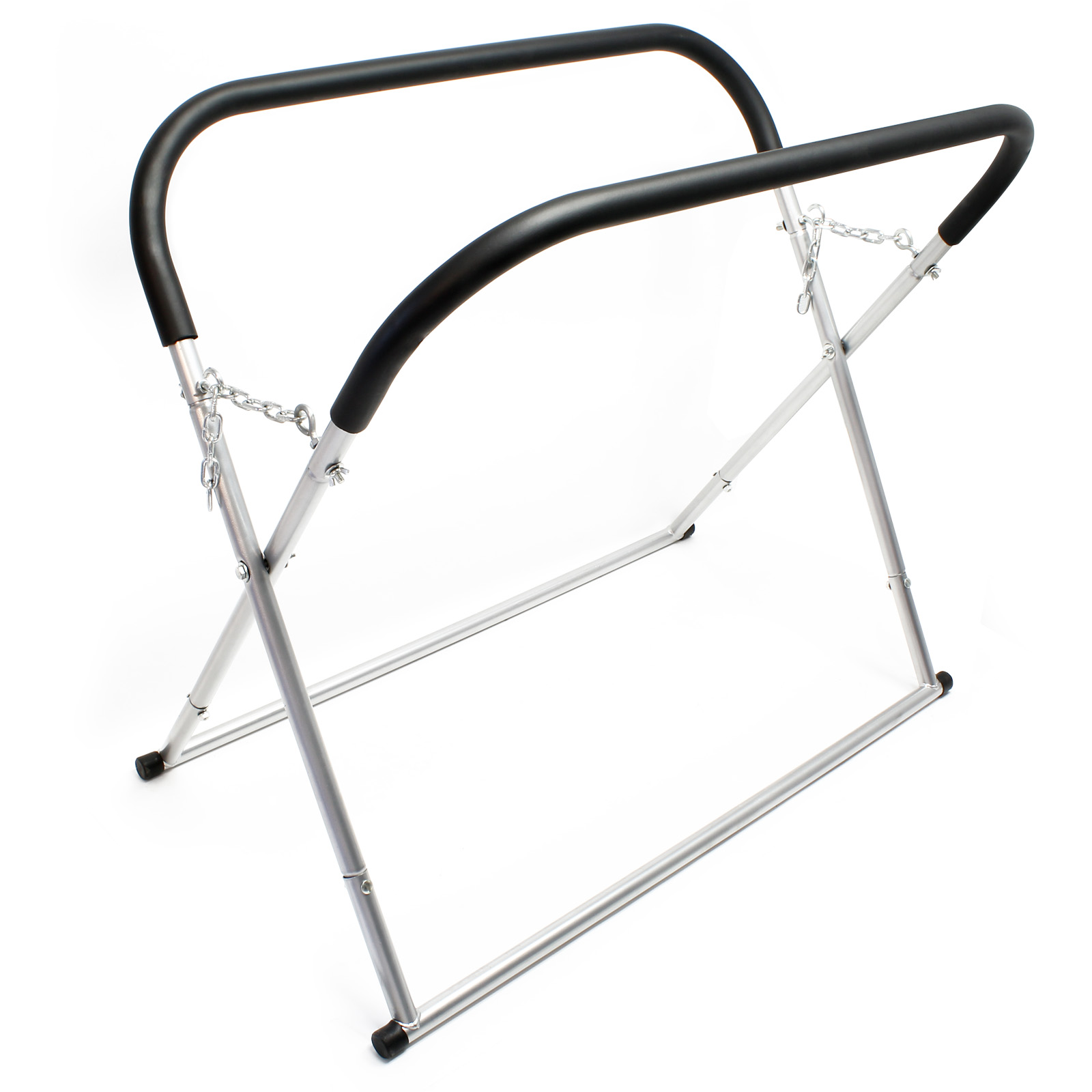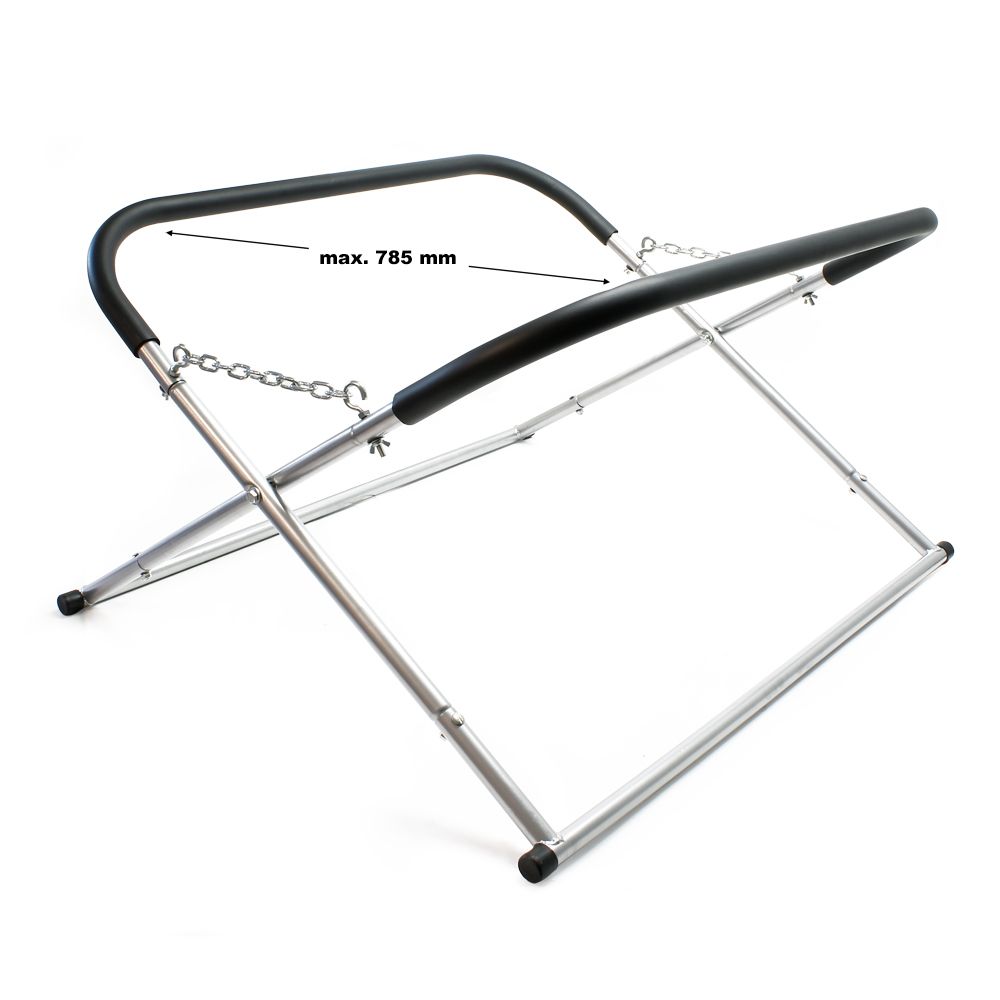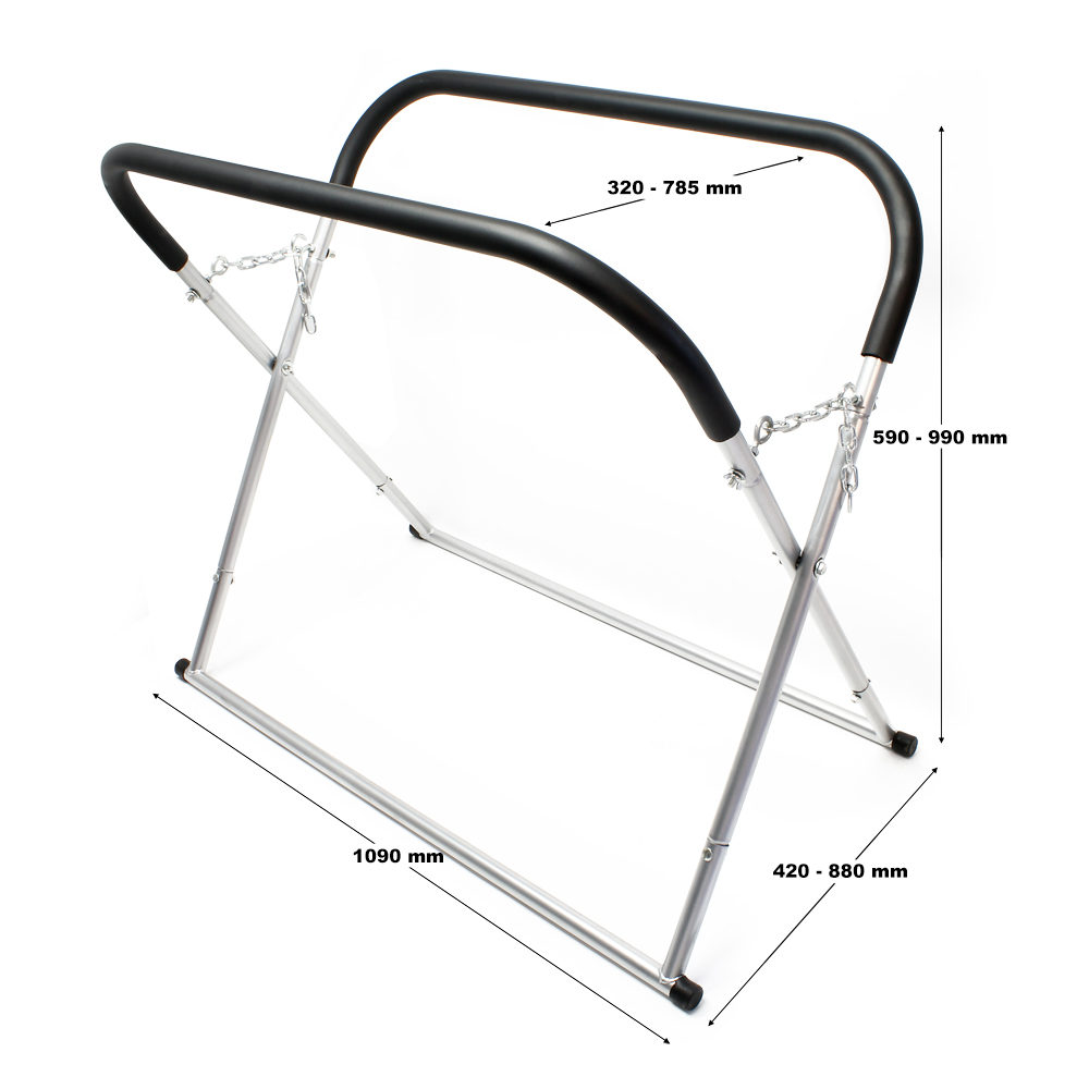 Robustní a stabilní pomocný stojan se skládá z konstrukce ocelové trubky, která má zčásti pěnový kryt, čímž zajišťuje protiskluzovou podporu a chrání citlivé předměty. Montážní stojan má rozměry: 105 x 80 x 100 cm je stojan je výškově nastavitelná. Různé pracovní výšky lze přizpůsobit podle potřeby řetězy mezi 80 a 100 cm. Maximální zatížení je 50 kg, čistá hmotnost je 7 kg. Tento