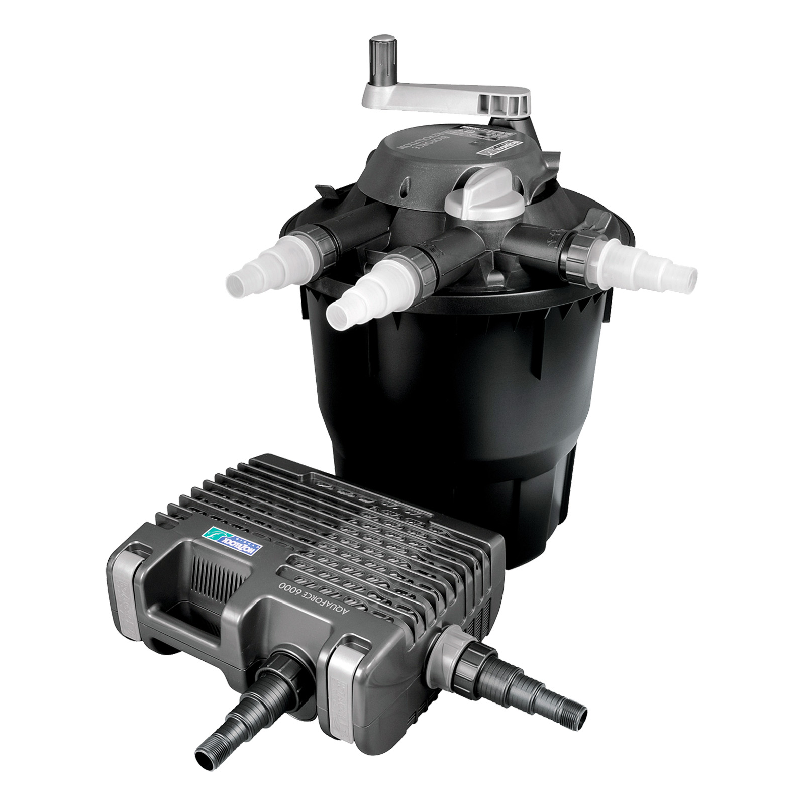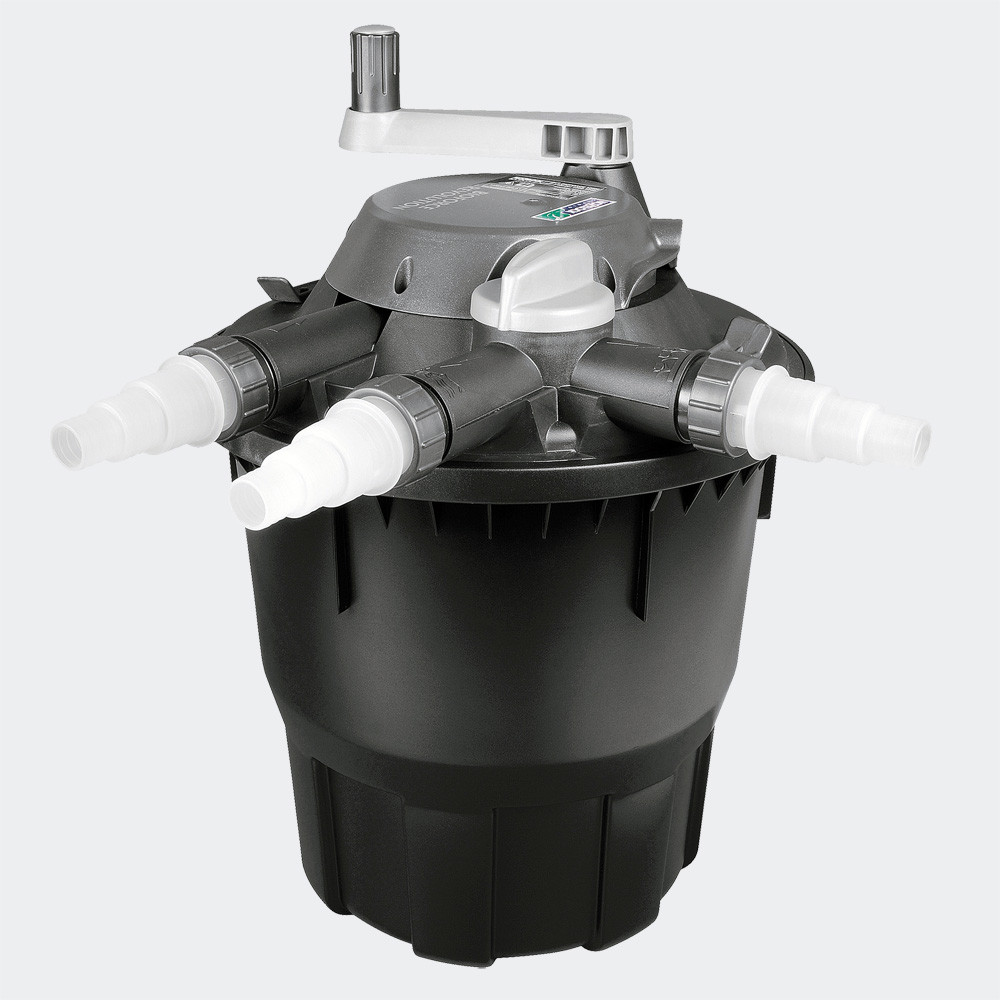 Kompletní sada filtrů pro jezírka do 18 000 litrů (rybníky pro ryby 9000 litrů) sestávající z Bioforce Revolution 18000 a čerpadla odpadní vody AquaForce o objemu 6 000 litrů za hodinu pro přepravu větších částic nečistot z rybníka do filtru rybníka. Bioforce Revolution je účinný tlakový filtr s vestavěným UVC čističem a jedinečným čisticím mechanismem, který lze umístit vedle rybníka nebo jej částečně zakrýt v zemi, takže je do značné míry skrytý před zrakem. Protože se v tomto filtru vytváří tlak, lze vodu opouštějící filtr také použít k napájení vodopádu, aniž by musel být filtr umístěn v horní části vodopádu. Nečistoty dodávané zařízením AquaForce 4000 jsou velmi účinně odfiltrovány z vody v jezírku pomocí filtračních bloků Cypricube. Cypricube, vyvinutý výhradně společností Hozelock, sestává ze stovek malých čtvercových pěnových kostek, které společně tvoří velkou filtrační plochu, což má za následek vynikající čisticí účinek. Přefiltrovaná voda poté vstupuje do spodní komory Bioforce Revolution, kde je umístěno Kaldnesovo biomedium, které poskytuje velmi velkou adhezní plochu a nepřetržitou obnovu bakterií. Tyto bakterie jsou nepostradatelné pro rozklad škodlivých částic nečistot a jejich přeměnu na užitečné látky pro jezírko. Integrovaný UVC čistič má 18 Wattovou UV lampu, aby se zabránilo „zelené vodě“ v důsledku plovoucích řas. Výsledkem je jasný, ale také velmi zdravý rybník. Všechny Bioforce Revolution mají jedinečný čisticí mechanismus, který vám umožní vyčistit filtr během několika minut a odstranit nečistoty. Otočením otočné rukojeti na horní straně filtru pěnové bloky Cypricube jsou opláchnuty ve filtru. Znečištěnou vodu lze snadno vypustit z filtru otočením spínače na víku. Pomocí dodávaných hadicových přípojek můžete k filtru snadno připojit jezírkovou hadici o průměru hadice Ø 20/25/32 nebo 25 mm.