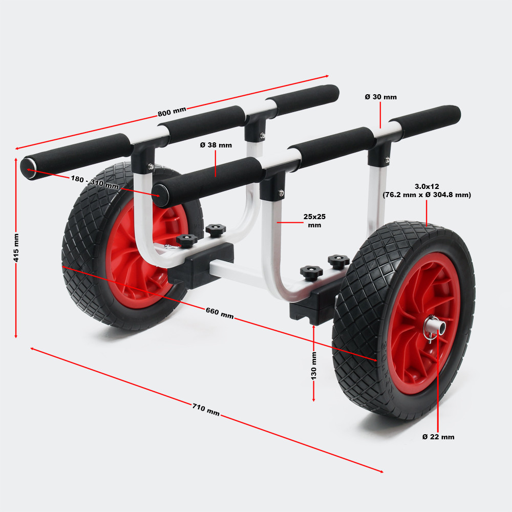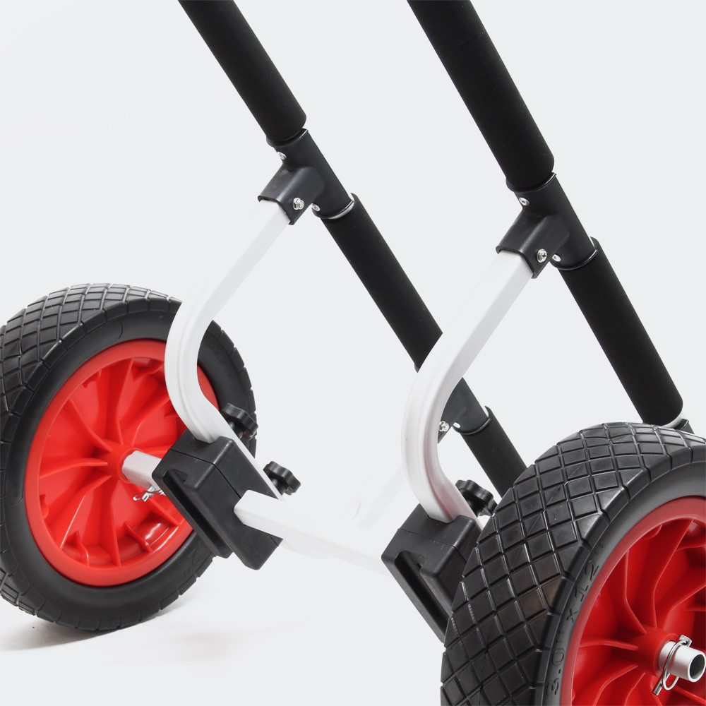Tento kompaktní přepravní vozík pro kajaky, kánoe a další malé brouzdaliště usnadňuje přepravu do a z vody. Vozík je vyroben z vysoce kvalitní hliníkové konstrukce a má dvě velká kola vyrobená z PU (polyurethanu) o průměru 31 cm. Kajaky o hmotnosti až 90 kg lze snadno tlačit nebo táhnout.