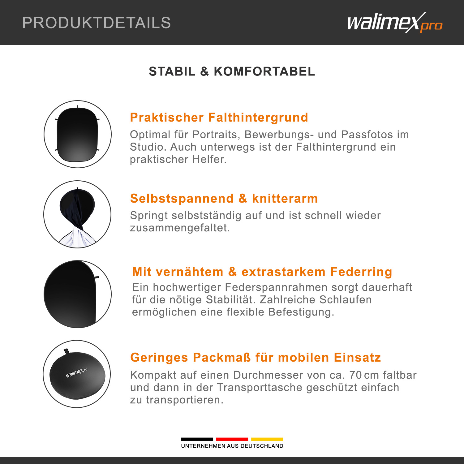 skládací pozadí je vyrobeno z polyesteru, který se téměř nemáčí. Skládací pozadí 2 v 1 je ideální pro portrétní fotografii, fotografii lidí a obchodní fotografii. Dobře se osvědčí i při ořezávání v produktové fotografii, a to jak s bílou, tak s černou stranou. Je také ideální jako neutrální pozadí pro videohovory při práci z domova.
