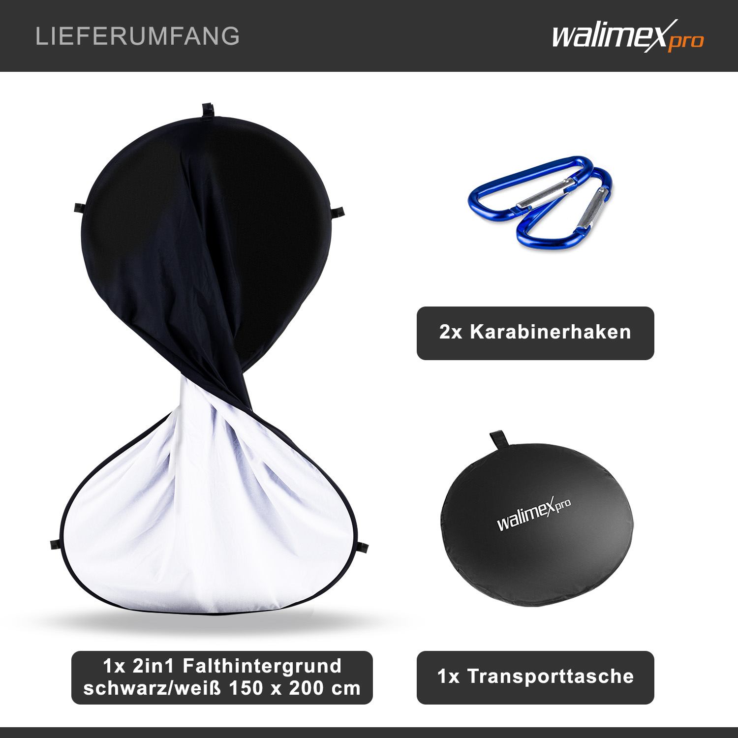 • Oboustranné skládací pozadí 150 x 200 cm, černobílé, se 2 karabinami pro zavěšení a praktickou přepravní taškou