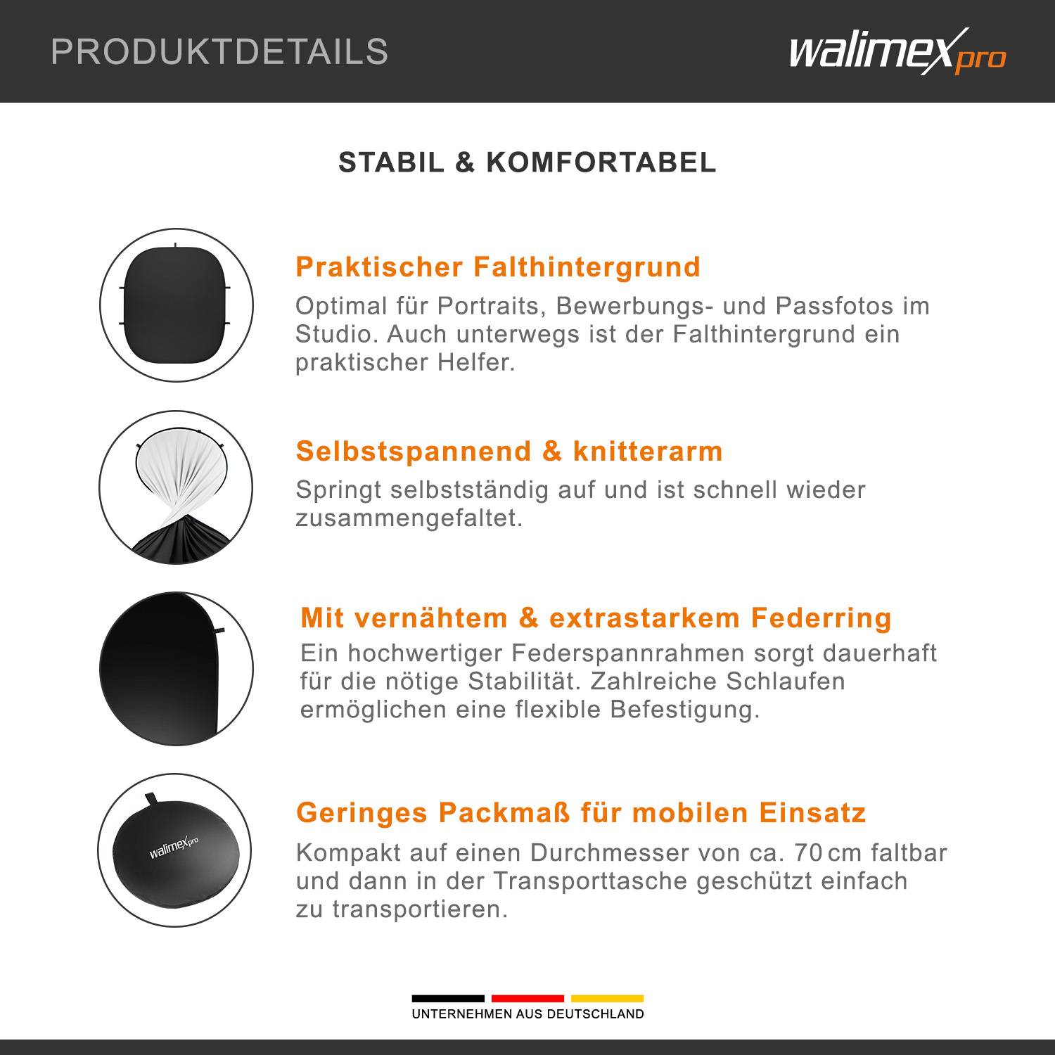 Skládací pozadí je vynikající kvality. Jeho všitý extra pevný pružinový kroužek zaručuje hladký a bez záhybů povrch pozadí. Díky skládacímu mechanismu