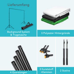 Instarter pozadí systém 1,55-3,05 m široký I se 3 pozadími (zelené, černé, bílé), svorky pro fotografování a zelené plátno I Systém foto pozadí studio I Pro pozadí z papíru a látky