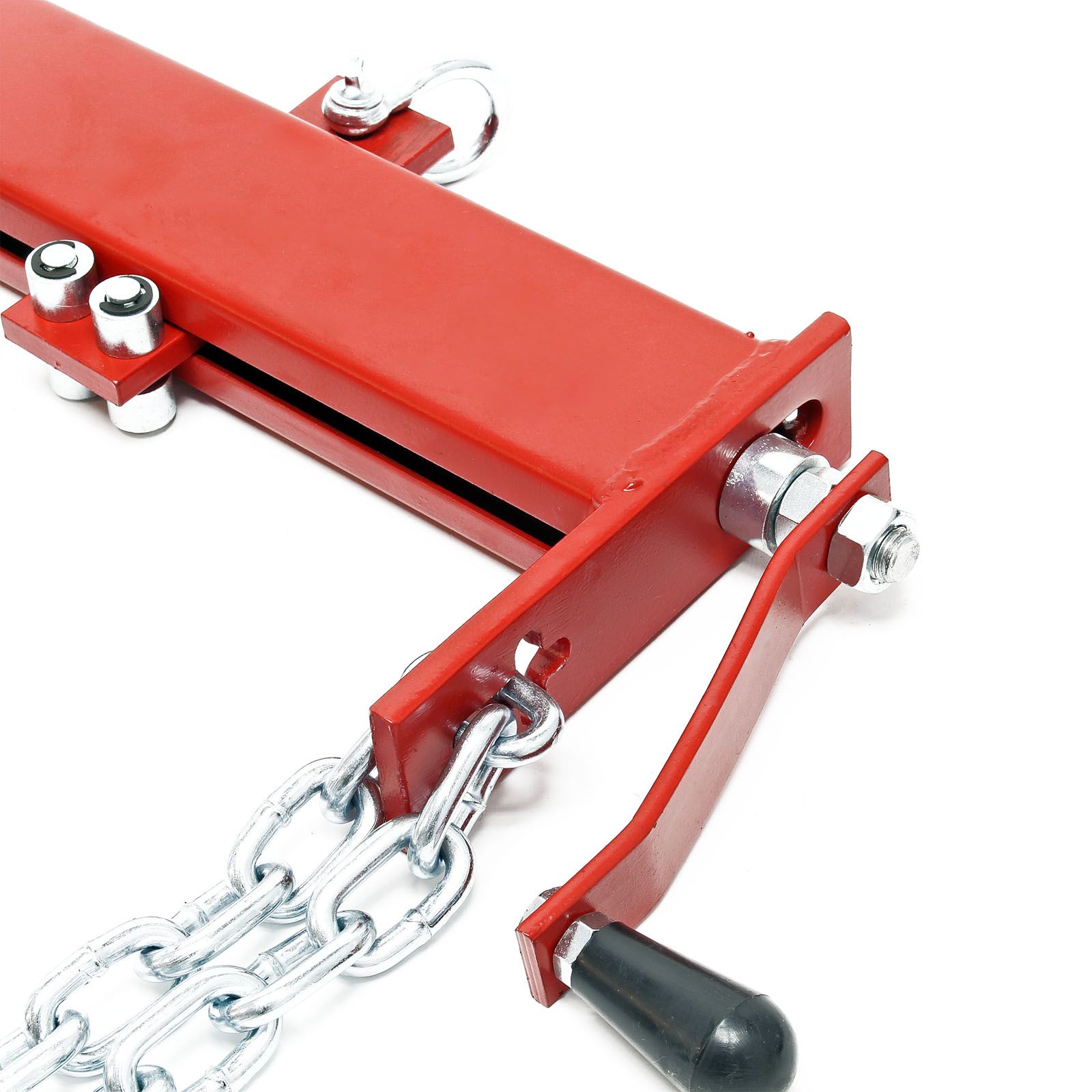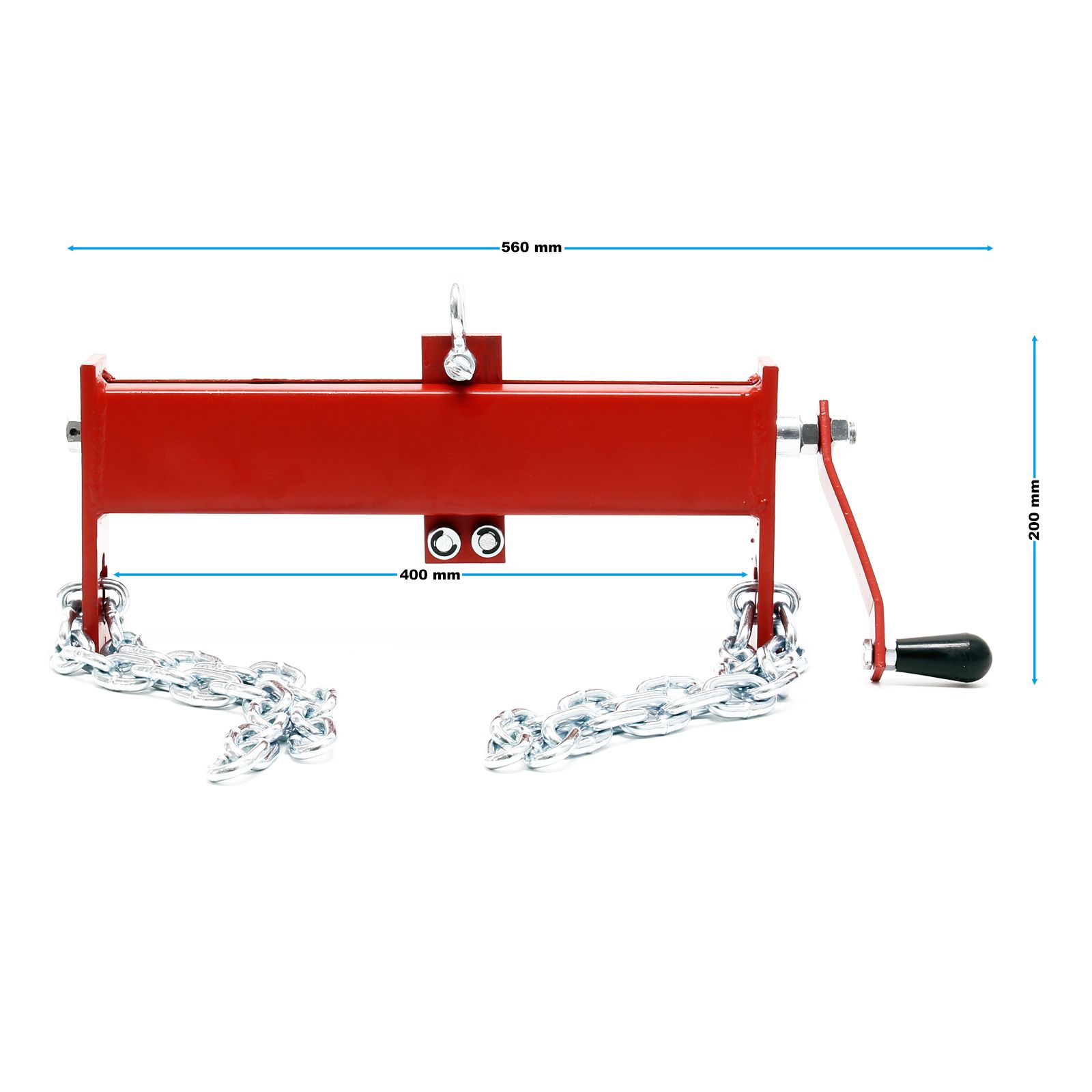 | Rozměry: | Celkové rozměry: 620 × 610 × 60 mm Nosník: 400 × 50 × 10 mm Délka řetězu: 740 mm Průměr řetězu : 8 mm Šroubová tyč: 16 × 490 mm Pracovní plocha: 390 mm |